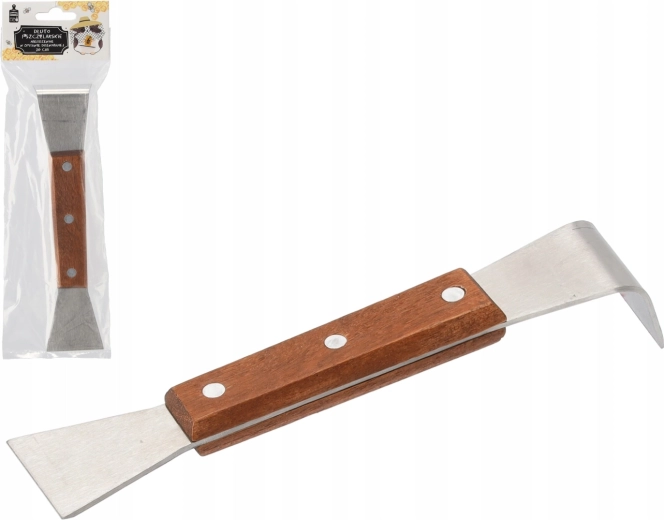 Univerzális méhész véső rozsdamentes acélból ergonomikus fa nyéllel és kampóval a keretek könnyű kiemeléséhez. Tartós, praktikus, és ideális a propolisz kaparásához, a keretek feszítéséhez és a kaptár mindennapi karbantartásához.