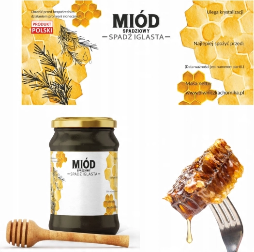 Könnyítse meg a mézesüvegek professzionális feliratozását minőségi címkékkel, amelyek a mézharmat (mézharmat-spórás) méz tűlevelűekből való jelölésére szolgálnak. A jól olvasható mezőknek köszönhetően a fogyasztó könnyen azonosítja a mézfajtát és a felhasználhatósági információkat.
