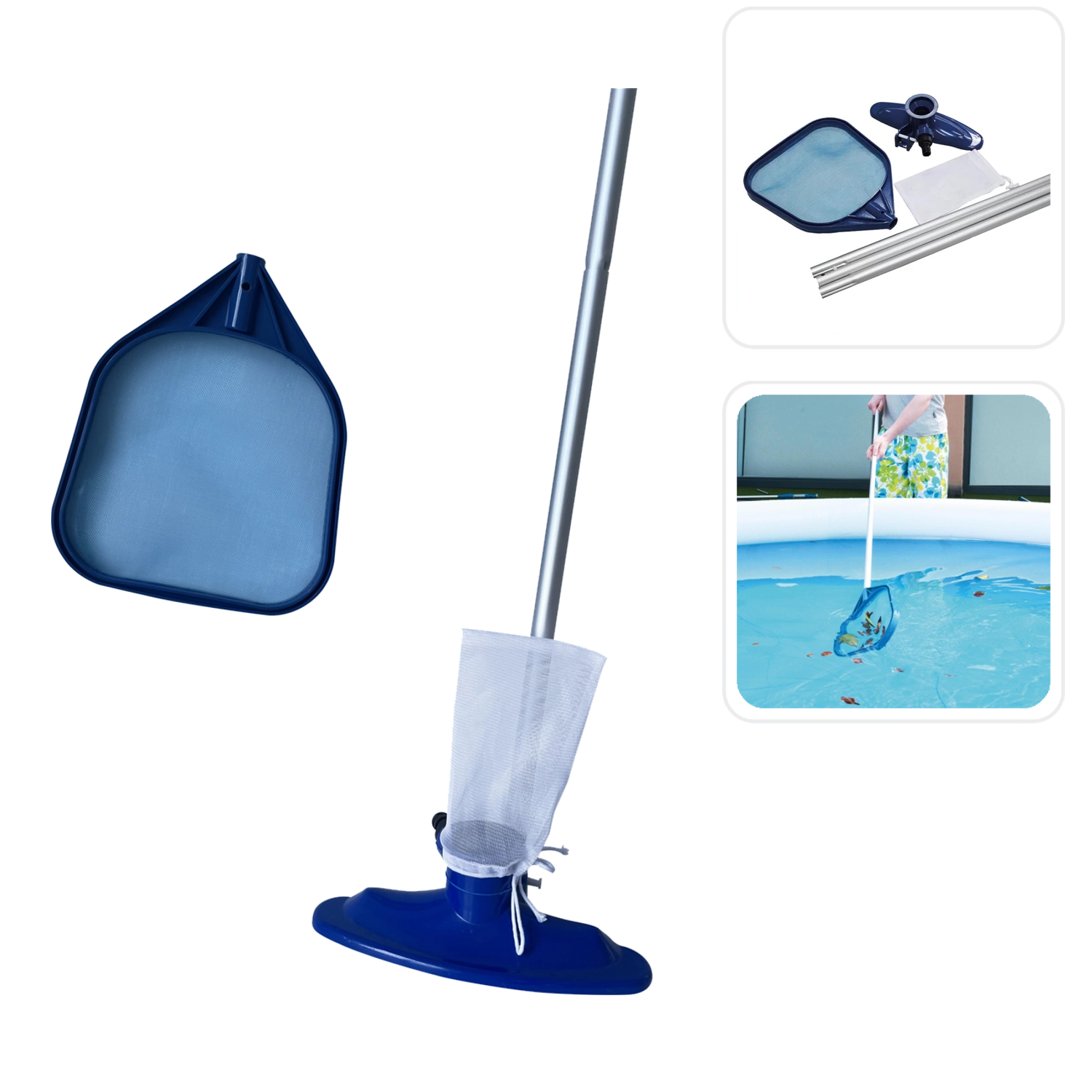 A porszívófej szűrőzsákkal eltávolítja a homokot és az apró szennyeződéseket az aljról, míg a finom háló könnyedén összegyűjti a leveleket és rovarokat a vízfelszínről.
