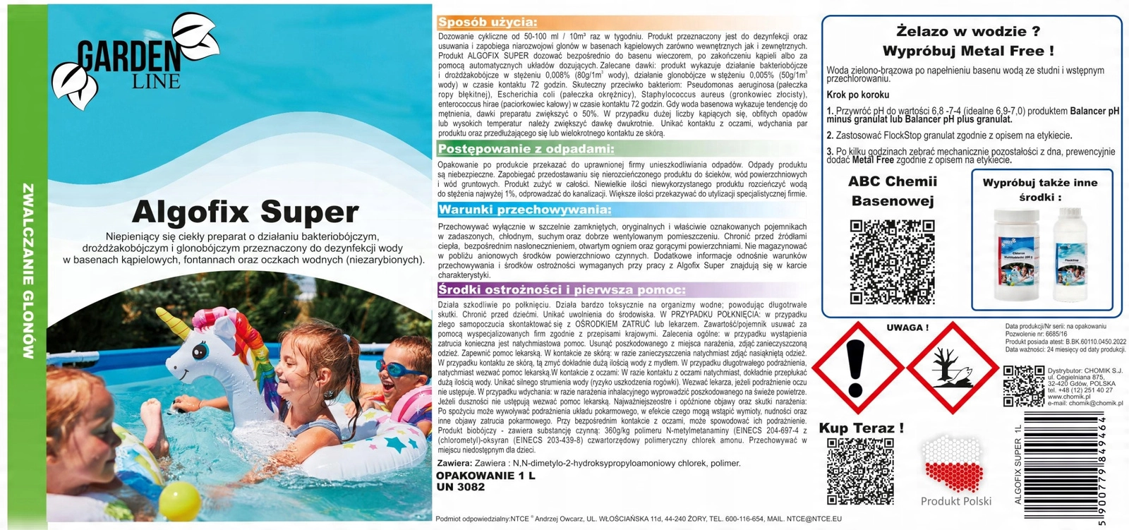 Az Algofix Super egy modern, habzásmentes folyékony készítmény a medencevíz komplex fertőtlenítéséhez. Hatékonyan pusztítja a algákat, baktériumokat és élesztőgombákat, a vizet kristálytisztán és biztonságosan tartja kültéri és beltéri medencékben, szökőkutakban és halmentes kerti tavakban. Ideális magas hőmérsékleten és intenzív használat esetén is, habképződés nélkül.