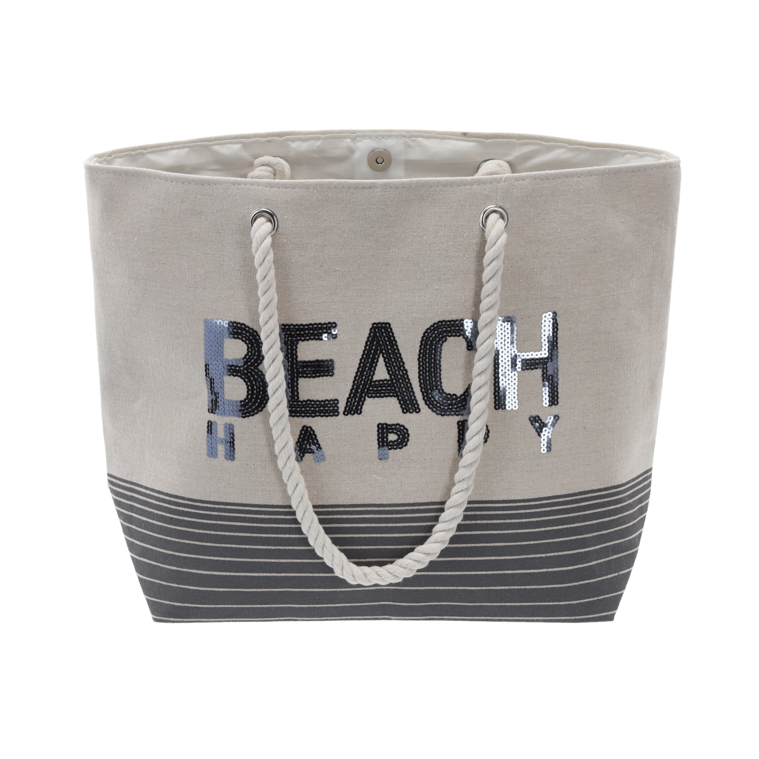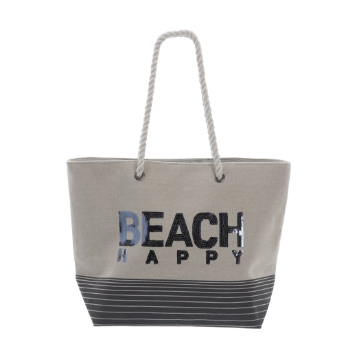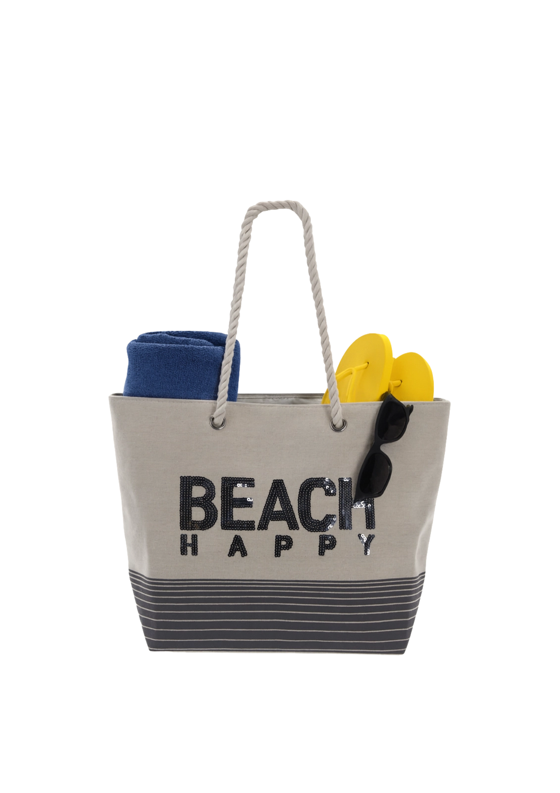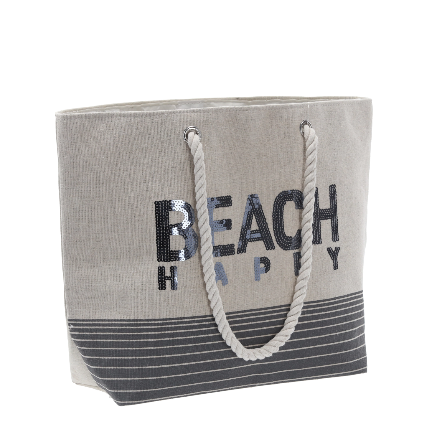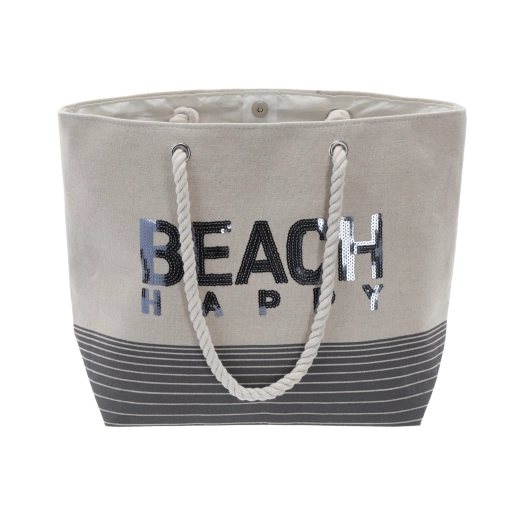 Stílusos és praktikus Beach Happy strandtáska 50 × 35 cm méretben, amely elegendő helyet kínál törölközőnek, naptejnek és egyéb nélkülözhetetlen holmiknak. A könnyű kialakításnak, a puha fogantyúknak és a belső cipzáras zsebnek köszönhetően ideális nyári kirándulásokhoz a tengerhez, a tóhoz vagy a városba.
