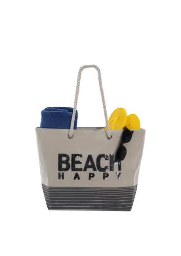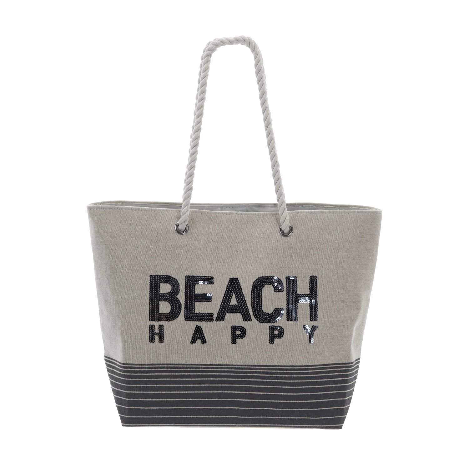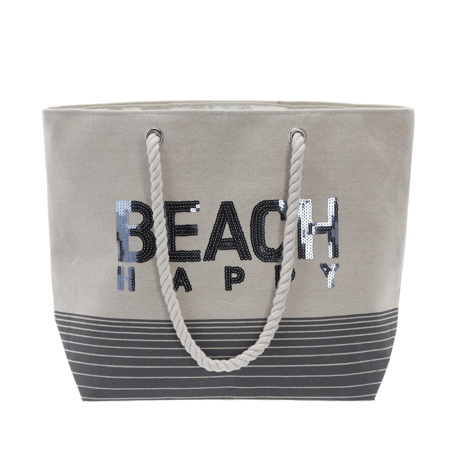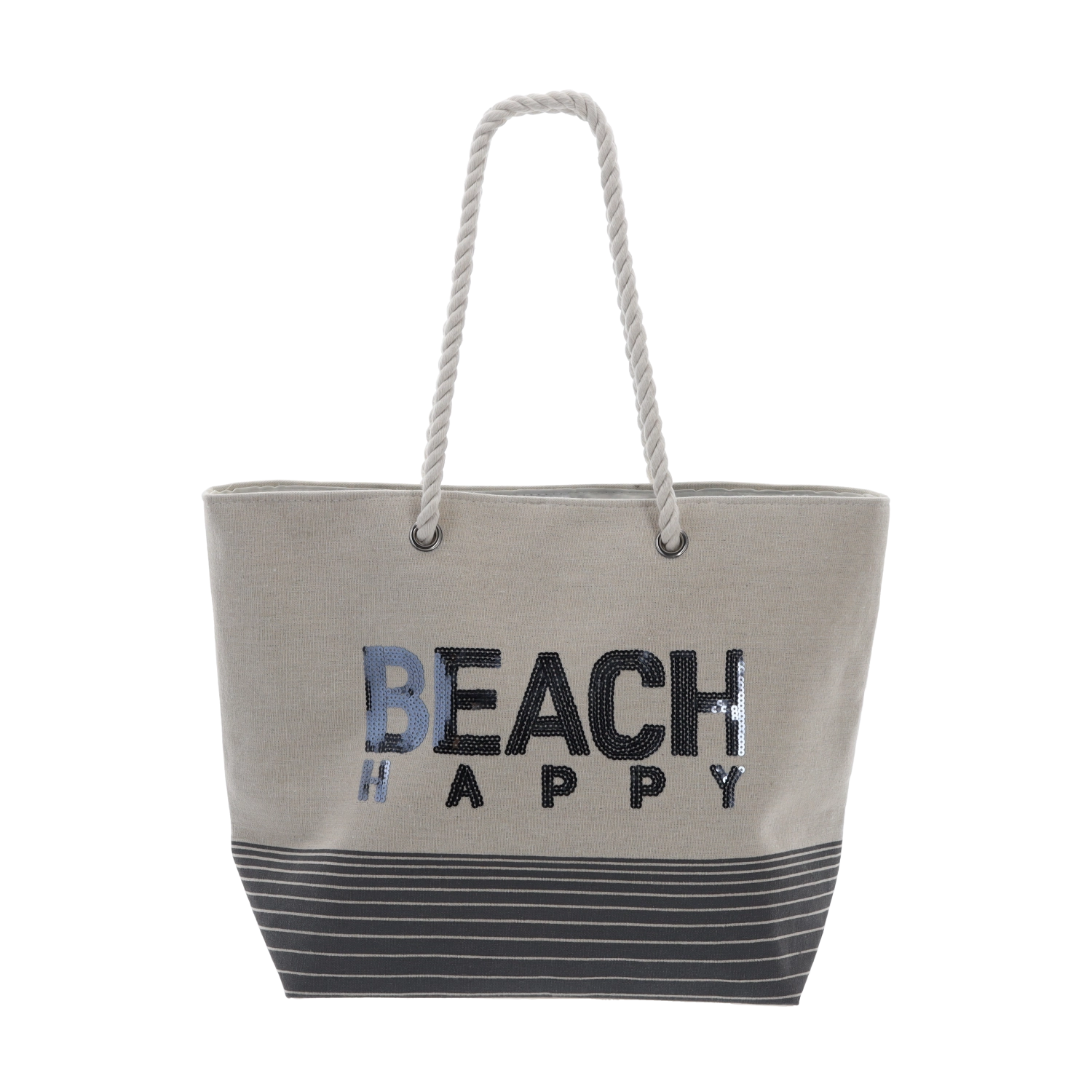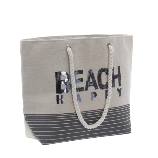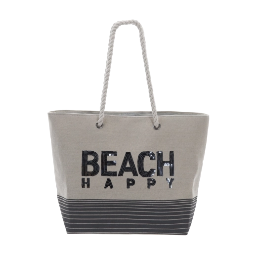 Stílusos és praktikus Beach Happy strandtáska 50 × 35 cm méretben, amely elegendő helyet kínál törölközőnek, naptejnek és egyéb nélkülözhetetlen holmiknak. A könnyű kialakításnak, a puha fogantyúknak és a belső cipzáras zsebnek köszönhetően ideális nyári kirándulásokhoz a tengerhez, a tóhoz vagy a városba.