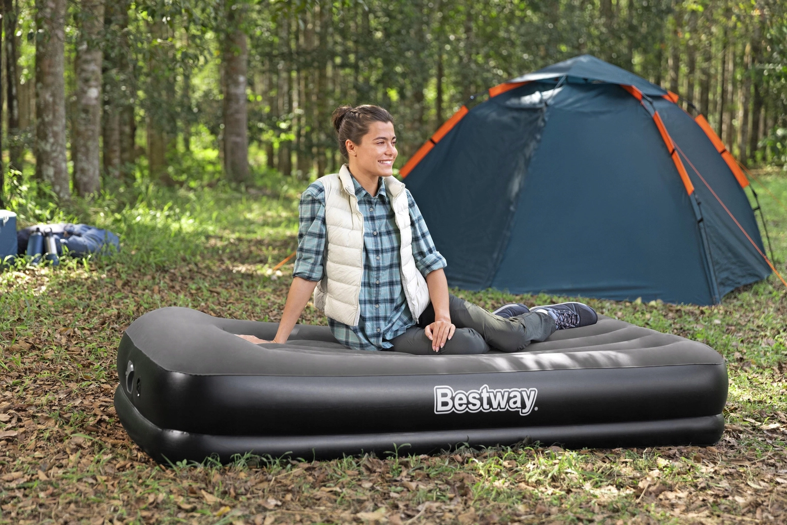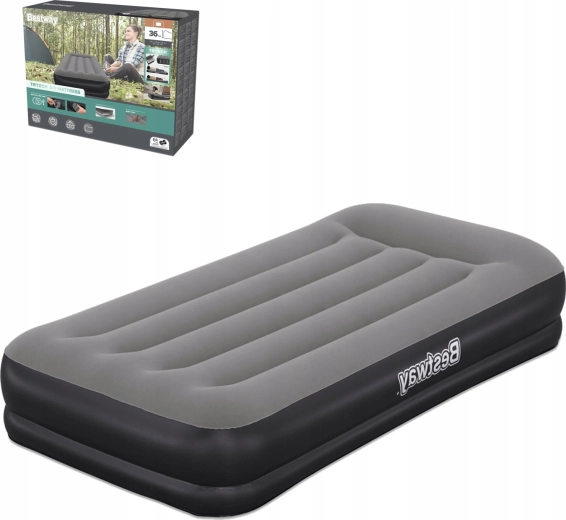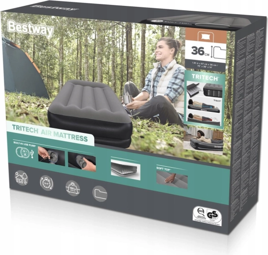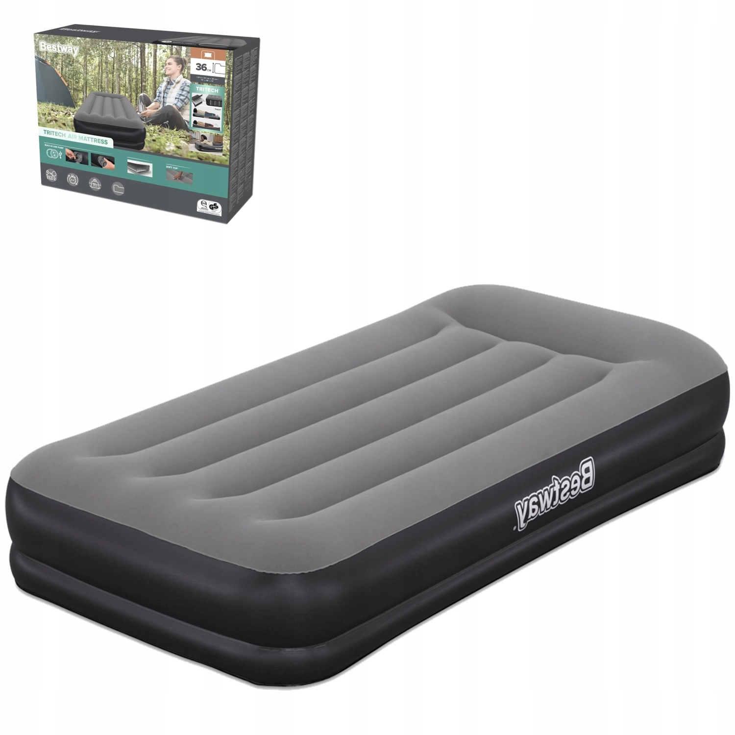 A BESTWAY TRITECH egyszemélyes felfújható matrac 191 × 97 × 36 cm méretben otthon és utazáskor is kényelmes alvást kínál. A beépített elektromos pumpának köszönhetően pár perc alatt felfújható, a tartós Tritech szerkezet tartja a formáját, a szarzszerű, bársonyos felület pedig kellemes tapintású. Az integrált párna, a könnyű leeresztés és az akár 150 kg teherbírás megbízható választássá teszi vendégek számára és kempingezéshez is.