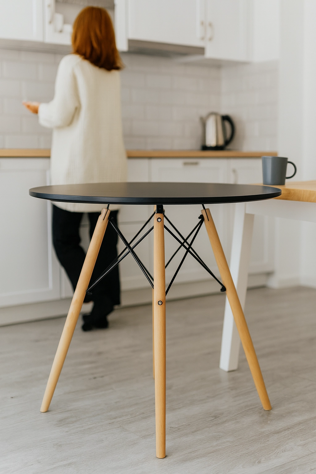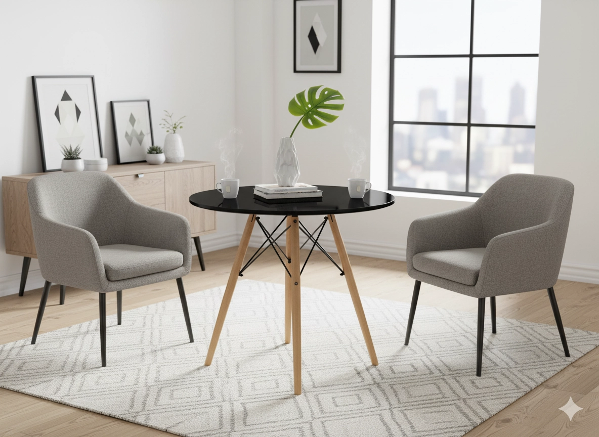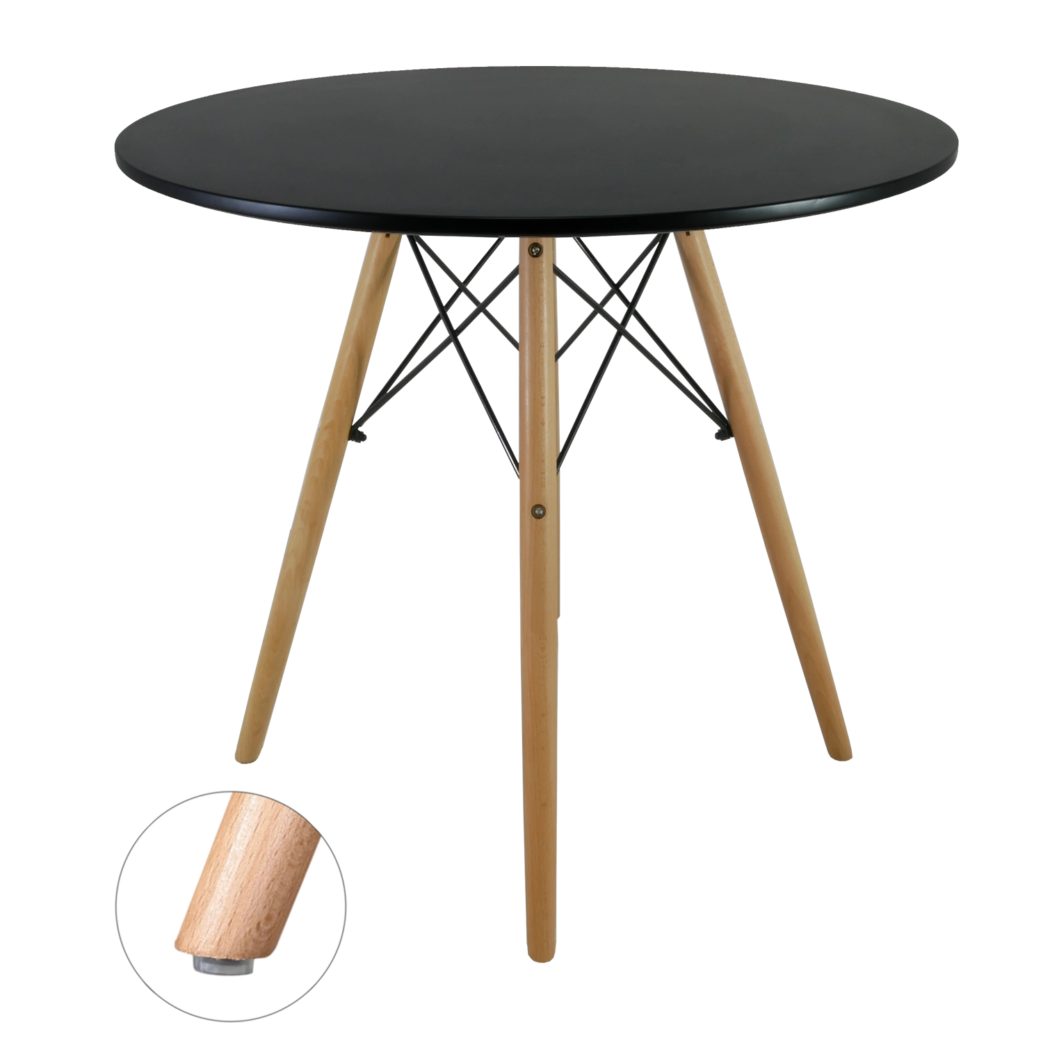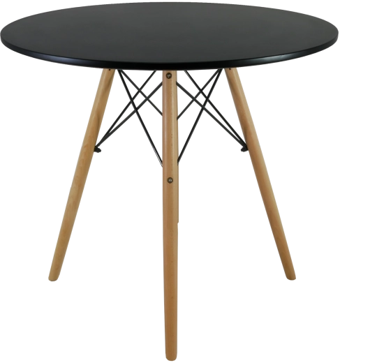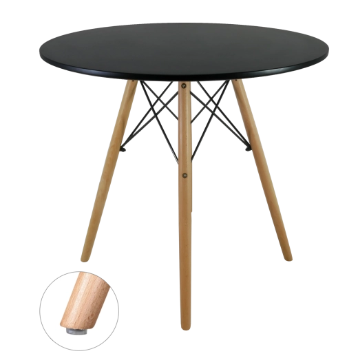 A matt fekete, kör alakú lap és a természetes fa lábak időtálló megjelenést teremtenek, amely könnyen illeszthető különféle enteriőr stílusokhoz.