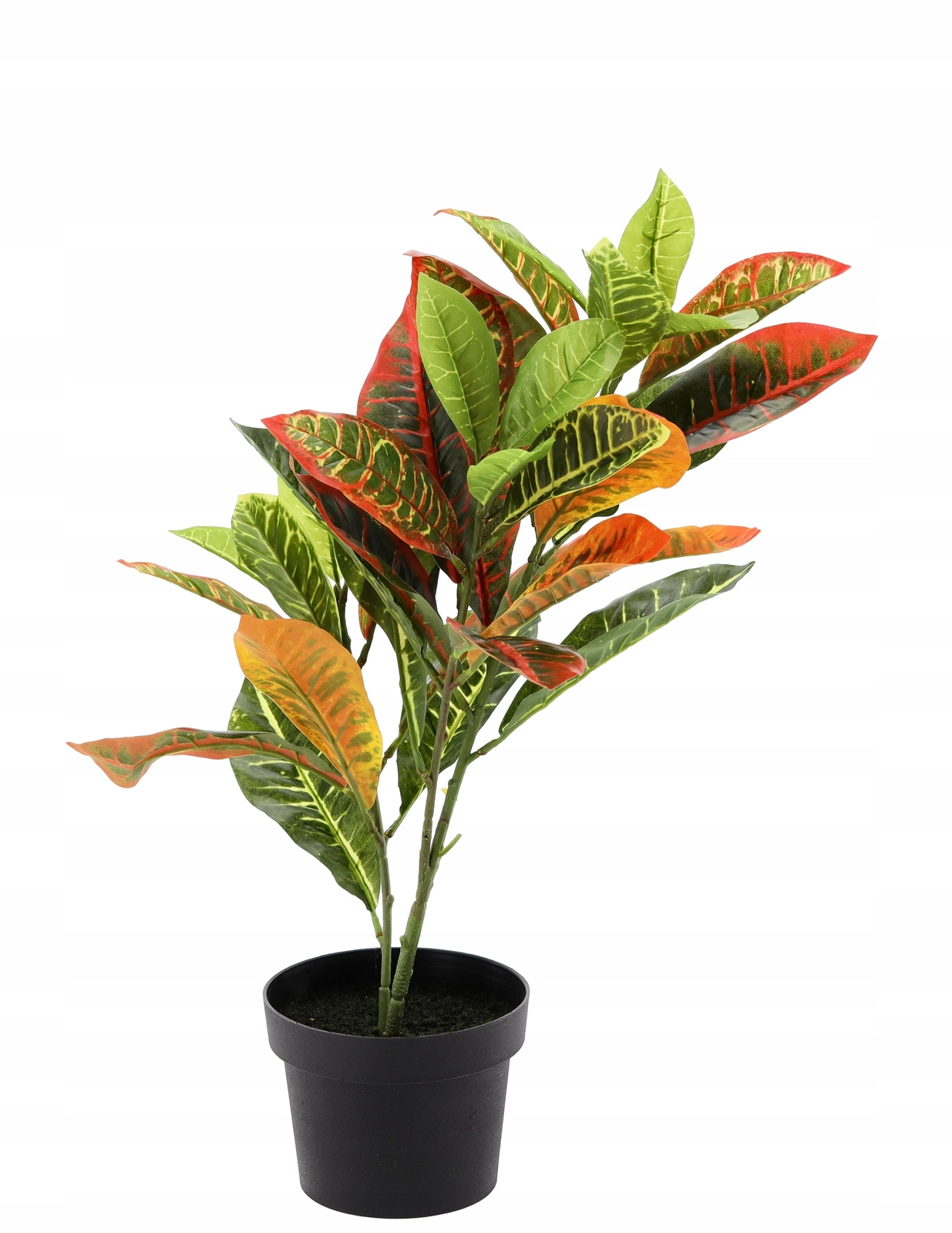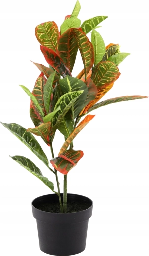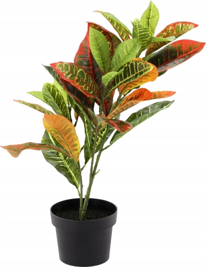 Frissítse fel a belső teret egy 58 cm magas, fekete cserépben lévő design műnövénnyel. Élethűen erezett, tarka leveleket kínál zöld, sárga és narancssárga árnyalatokban, amelyek természetes és feltűnő hatást keltenek. Ideális nappaliba, irodába vagy recepcióra – öntözés és karbantartás nélkül, mindig tökéletes megjelenéssel és könnyű elhelyezéssel polcokon, asztalokon és ablakpárkányokon.