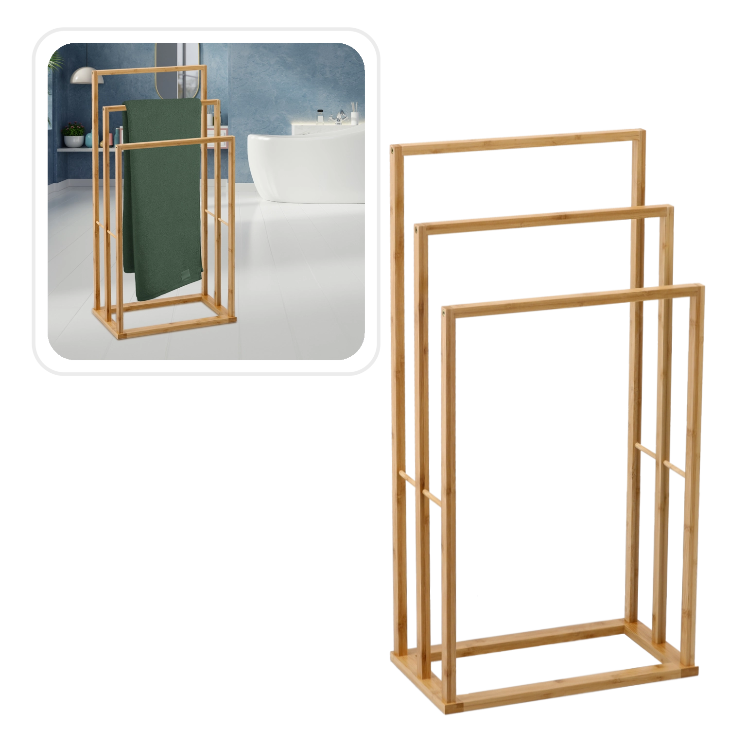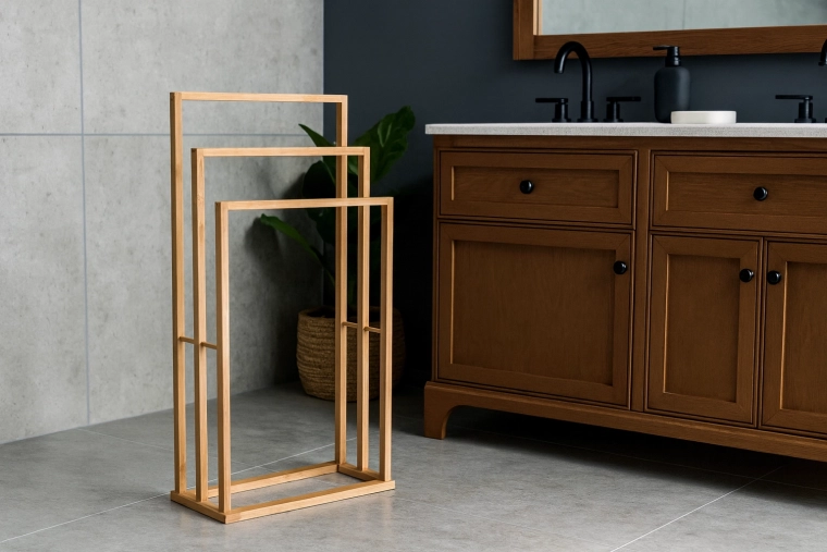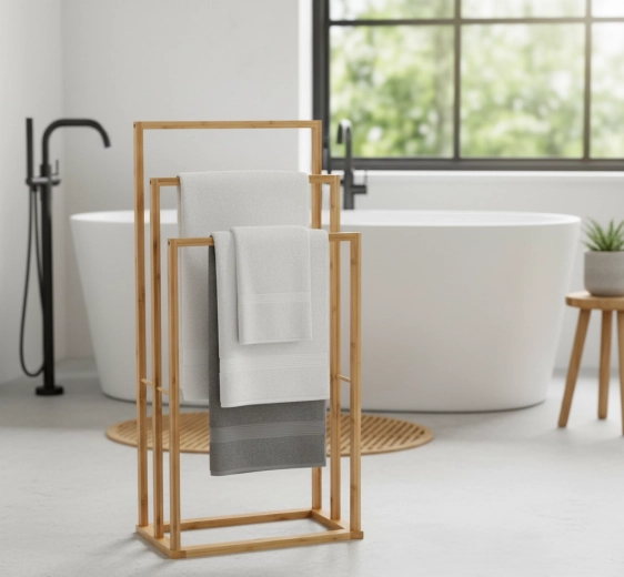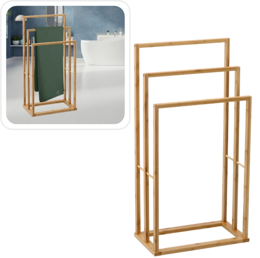 Dobja fel fürdőszobája rendezettségét stílusos, természetes bambuszból készült törölközőtartóval. A három, magasságban lépcsőzetes rúd bőséges helyet kínál a törölközők szárítására és áttekinthető tárolására az egész család számára. A minimalista, légies design támogatja a levegő keringését és felgyorsítja a száradást.