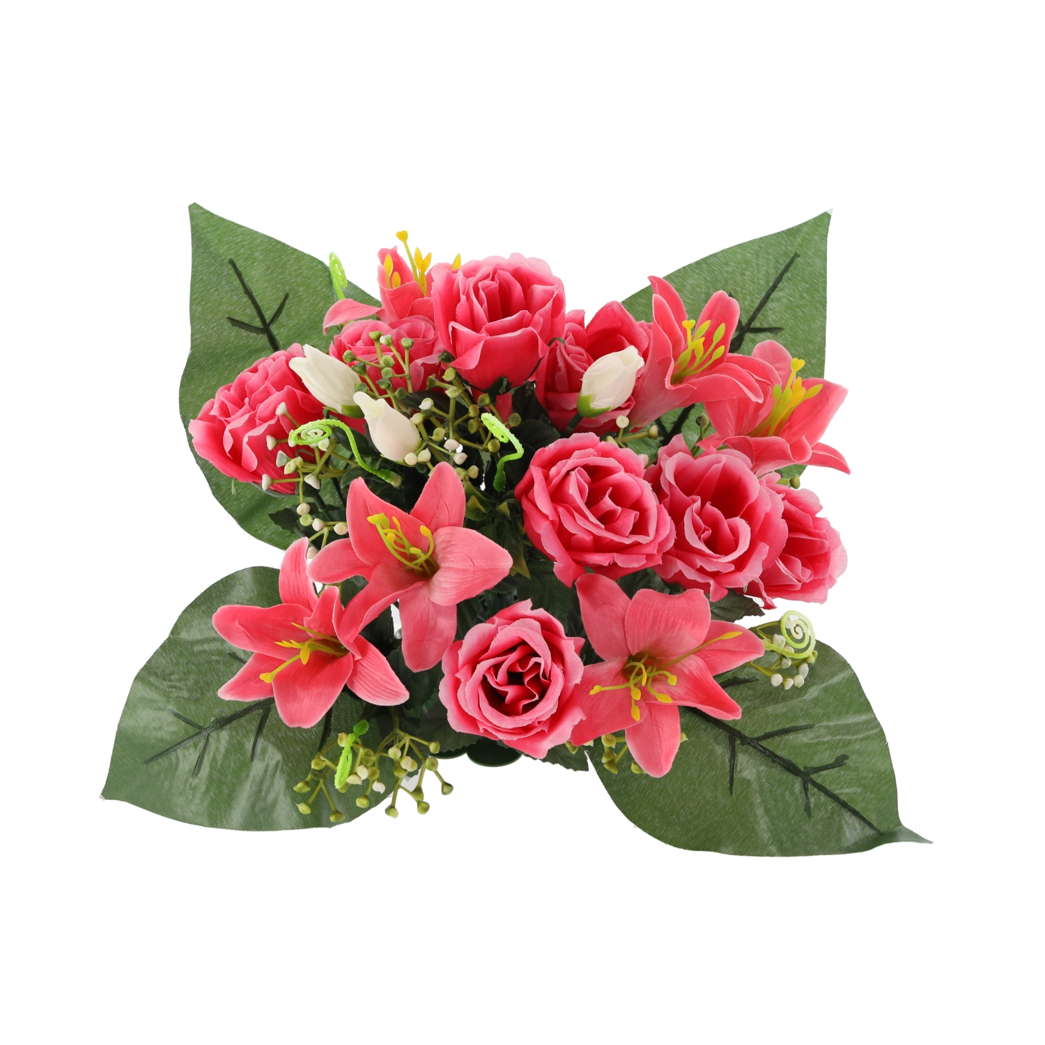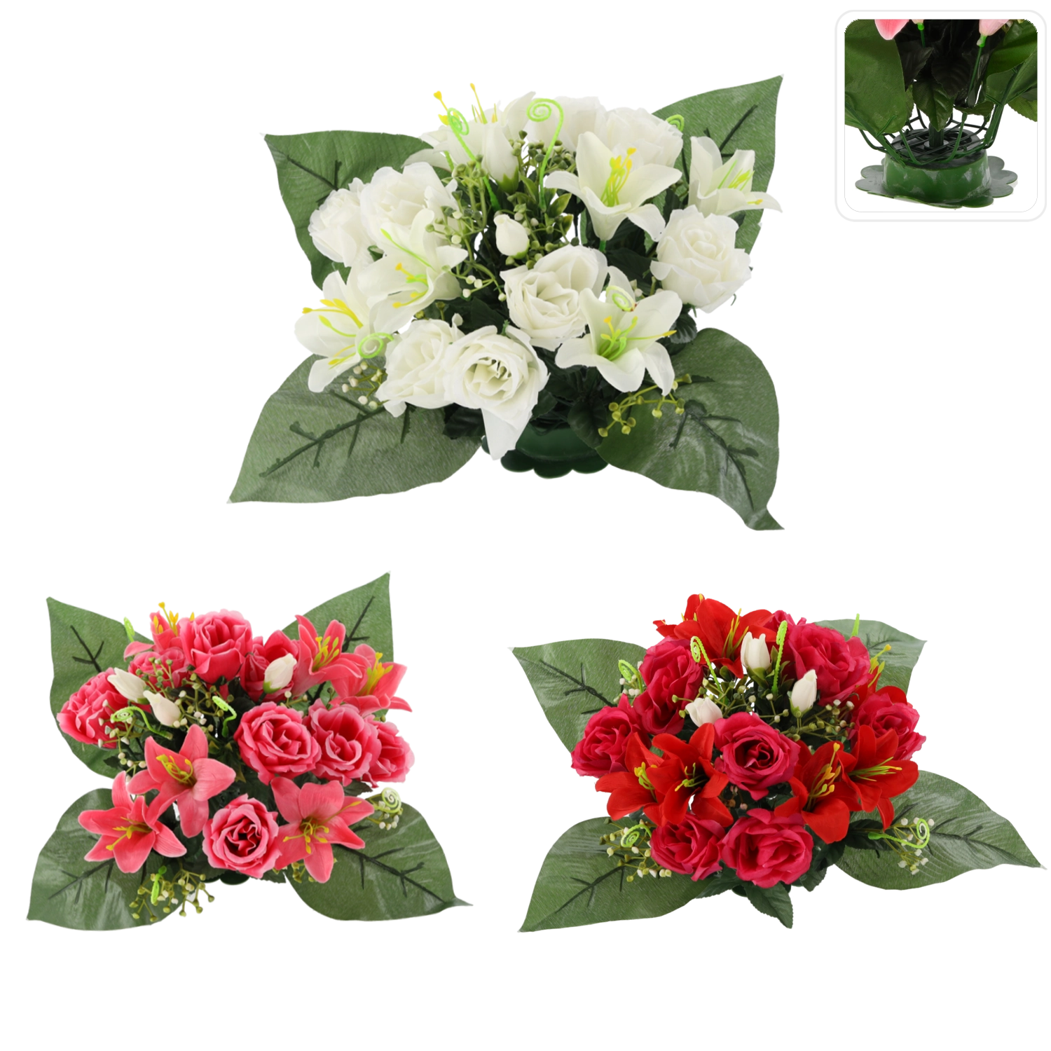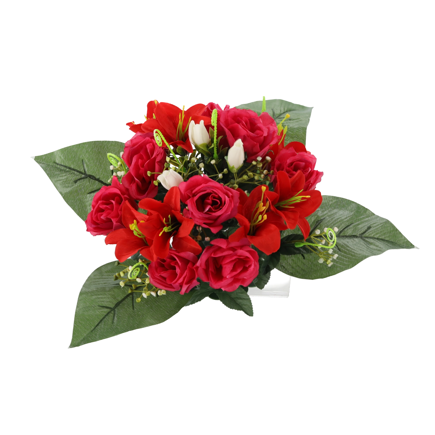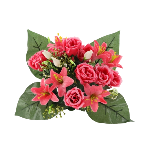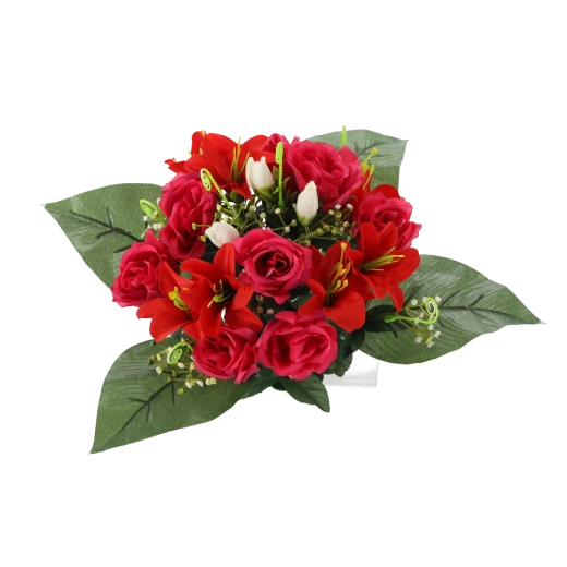 Elegáns, kompakt rózsa és liliom összeállítás 25 × 27 × 27 cm méretben. Vegyes színekben kapható, élethű részletekkel és hosszú élettartammal, gondozás nélkül – ideális dekoráció otthonra, recepcióra és emlékhelyre is.