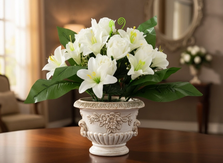 Válasszon a vegyes színek közül, hogy könnyen illeszkedjen különböző enteriőrökhöz vagy szezonális díszítésekhez. Az elrendezés nem igényel öntözést vagy különleges gondozást, mégis hosszú távon megőrzi formáját és színeit – kiváló otthoni dekorációhoz, munkahelyre, recepcióra és emlékhelyre egyaránt.