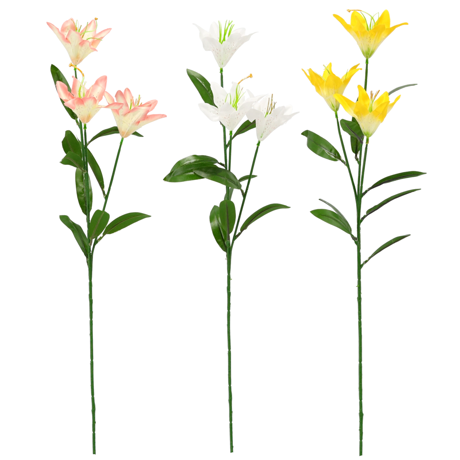 Elegáns és élethű mű liliom három virággal, 64 cm magasságban, amely remekül kiegészíti az otthoni, irodai és kereskedelmi terek enteriőrjét. A hű részleteknek, a vegyes színeknek és a nulla karbantartási igénynek köszönhetően egész évben friss hatást kelt.