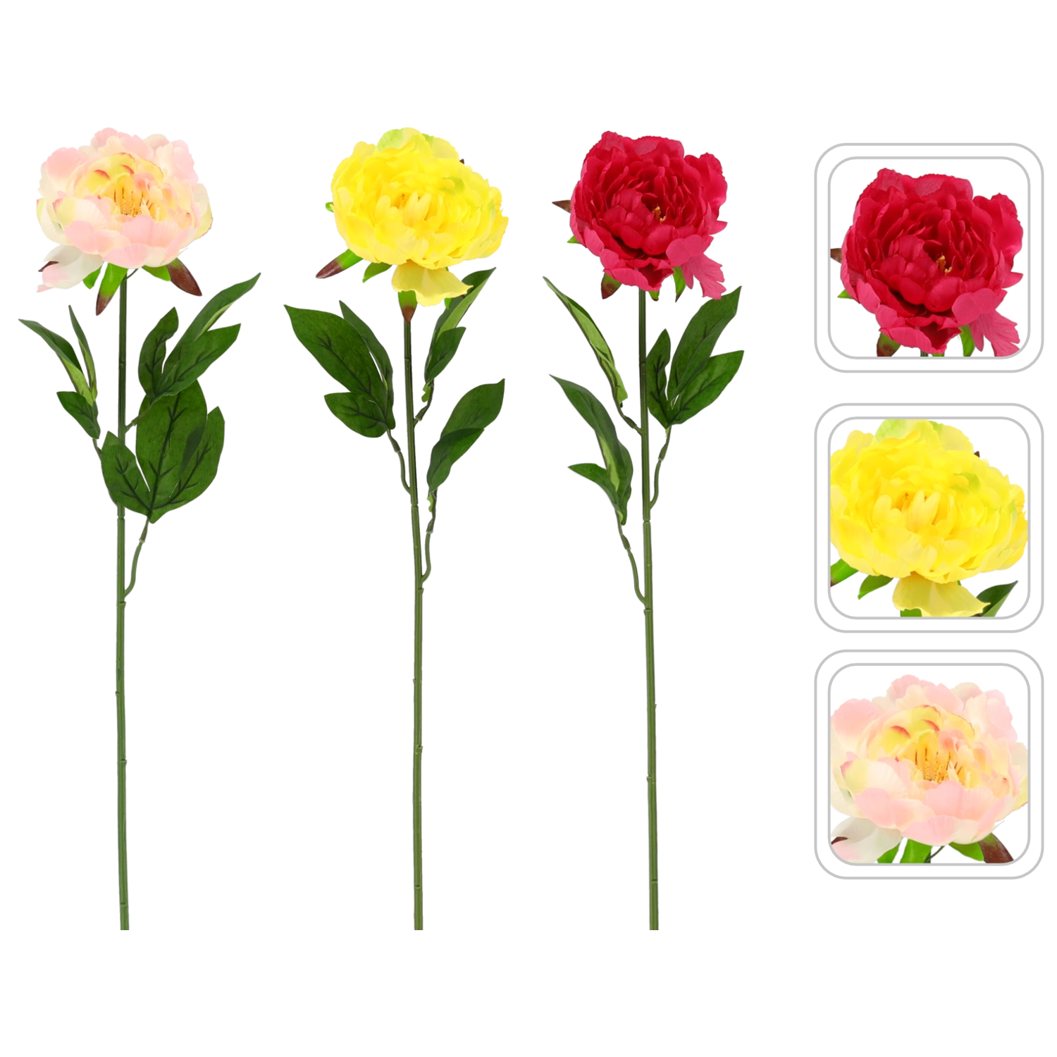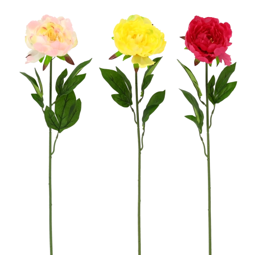 Elegáns és élethű mű pünkösdi rózsa, 65 cm hosszú, amely feldob bármelyik enteriőrt. Hűen megformált, telt virágai és természetes hatású levelei élő benyomást keltenek, nem igényelnek gondozást, és strapabírók, tartósak. Színmixben kapható (rózsaszín, sárga, piros), így könnyen összehangolható a dekorációkkal.