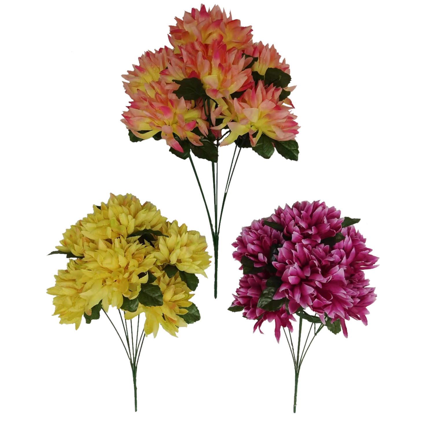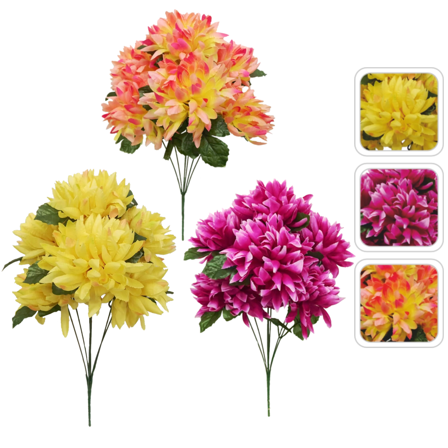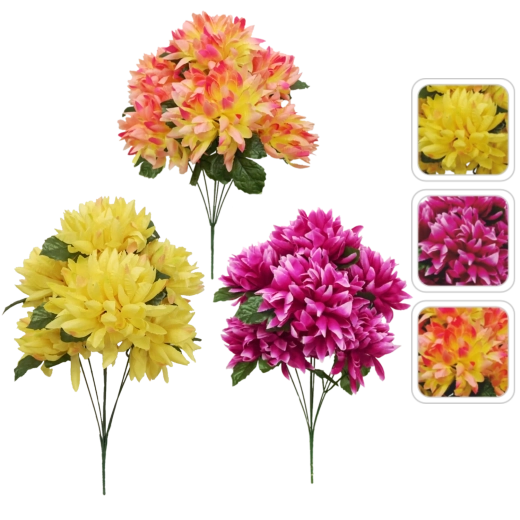 Az élethűen kidolgozott krizantémcsokor ideális választás azoknak, akik a virágok szépségét szeretnék öntözés és gondozás nélkül élvezni. A magas minőségű kivitelezés és a szirmok realisztikus részletei természetes hatást biztosítanak vázában és dekorációkban.
