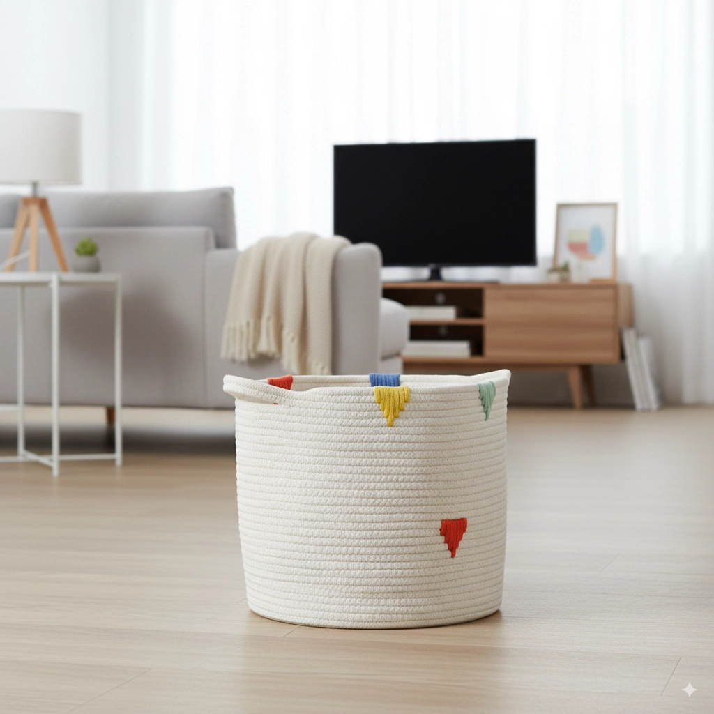 Fedezze fel az univerzális tárolókosarat, amely ötvözi a funkcionalitást és a dekoratív megjelenést. A semleges alapszín játékos színes akcentusokkal nappaliba, hálóba és gyerekszobába egyaránt illik. A puha textil kivitel kíméletes a padlókhoz és bútorokhoz, ugyanakkor elég masszív a mindennapi használathoz.