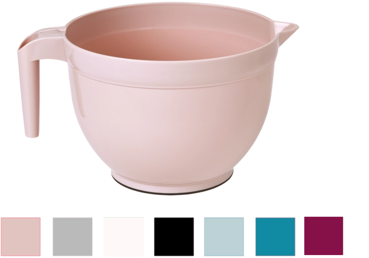 A tartós, BPA-mentes műanyag élelmiszerrel érintkezve is biztonságos, és bírja az intenzív használatot. A csúszásgátló gumitalp szilárdan a helyén tartja a tálat, így a sűrűbb keverékeket is eltolódás nélkül keverheti. A karbantartás egyszerű – a tál mosogatógépben mosható, így időt és fáradságot takarít meg.