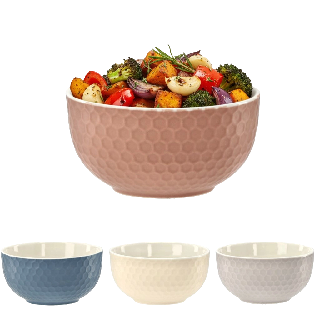 A dombornyomott „honeycomb” felület nemcsak dekoratív, hanem praktikus is – a tál kellemesen kézre áll és kevésbé csúszik tálalás közben.