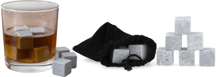 Csak helyezze őket néhány órára a fagyasztóba, majd adja a pohár whiskyhez, bourbonhöz vagy más kedvenc italához. A kövek többször használhatók, könnyen tisztíthatók, és a mellékelt bársonyzsákkal kényelmesen tárolhatók és szállíthatók.