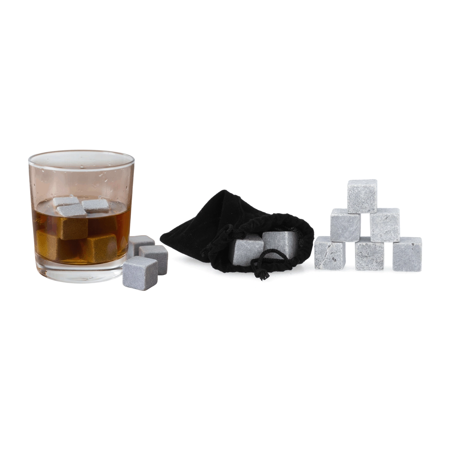 Hűtse italát felhígulás nélkül elegáns kőből készült jégkockákkal. Természetes kőből készültek, a whiskyt vagy a bourbont kellemesen hidegen tartják, és nem változtatják meg az ízt vagy az aromát. Csak tegye néhány órára a fagyasztóba, majd helyezze a pohárba. Többször használhatók, könnyen tisztíthatók, és praktikus bársonyzsákkal érkeznek tároláshoz és szállításhoz.