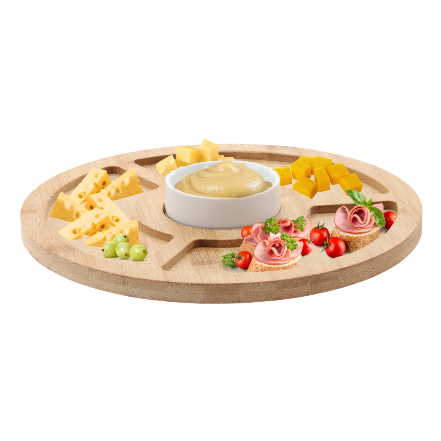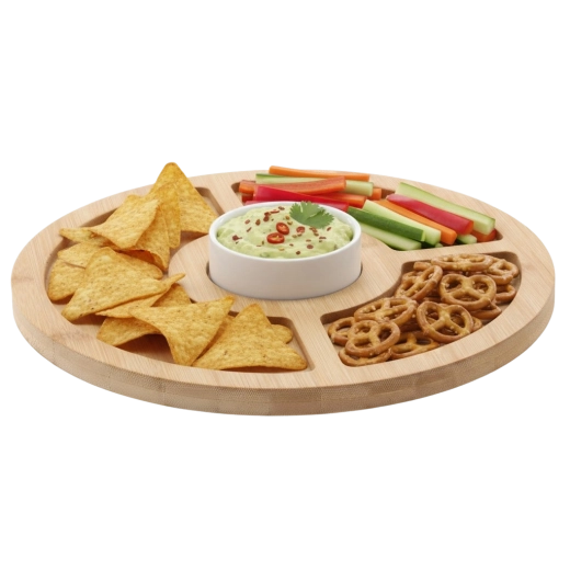 Ez a kerek bambusz szervírozótál porcelán tálkával remek megoldás otthoni vendéglátáshoz és társasági alkalmakra. A négy elkülönített rekesznek köszönhetően mindenféle falatkát a maga helyén tarthat, míg a középen elhelyezett porcelán tálka tökéletes a mártogatósokhoz és szószokhoz.