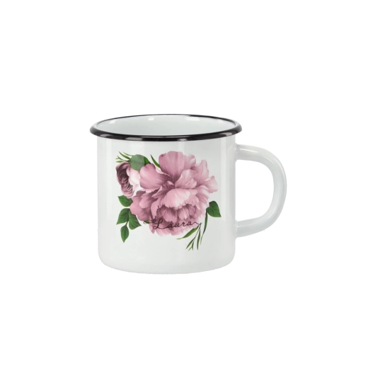 Elegáns, 1 l űrtartalmú, 11 cm magas, fehér színű zománcozott bögre Pünkösdirózsa Laura virágmintával. A zománc tartós felülete könnyen tisztítható, higiénikus, és ideális mindennapi használatra otthon és utazáskor is.