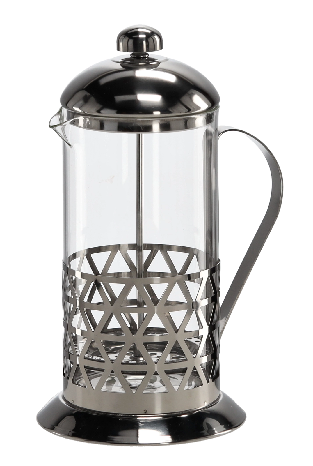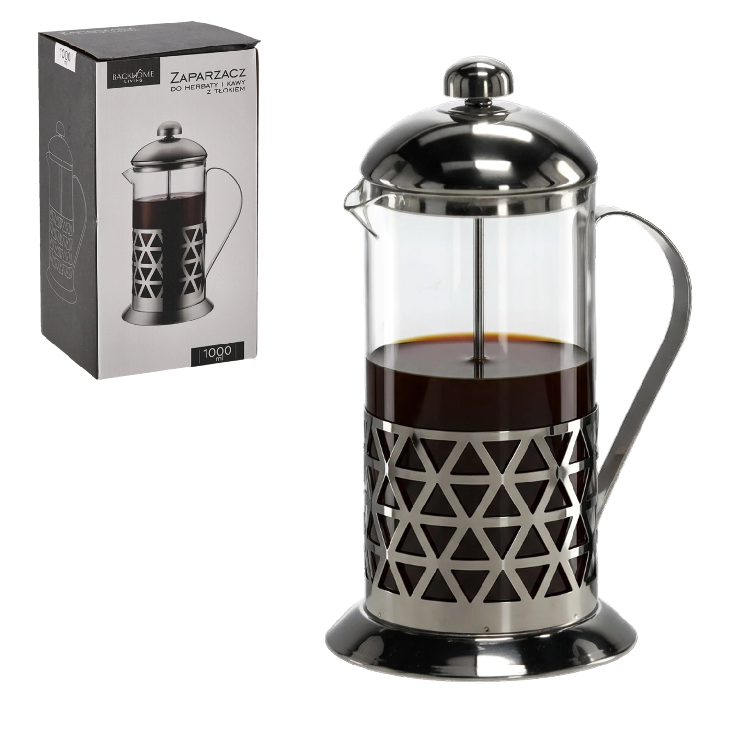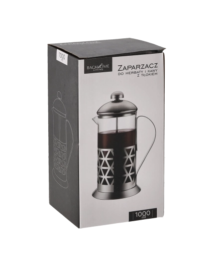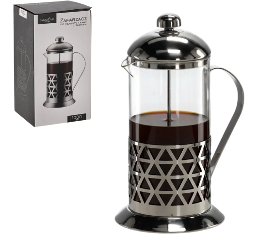 Elegáns karos french press 1000 ml űrtartalommal, kedvenc kávéja és teája egyszerű elkészítéséhez. A boroszilikát üveg és a rozsdamentes acél kombinációja biztosítja a hosszú élettartamot, a magas hőmérséklettel szembeni ellenállást és a tiszta, aromás extrakciót a finom szűrős dugattyúnak köszönhetően. Az ergonomikus fogantyú és a precíz kiöntőcsőr megkönnyíti a biztonságos, csöpögésmentes kiöntést.