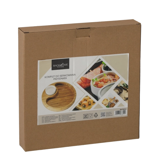 Ez a sokoldalú szervírozó készlet egyesíti a funkcionalitást és a stílust. Kompakt, kerek tálca természetes bambuszból kimart hellyel a porcelán mártogatós tálkának, amely kéznél tartja a szószokat, olajokat vagy pestót, rendetlenség nélkül. A bambusz természetes árnyalata és a hófehér tálka modern, időtálló megjelenést ad az asztalnak.