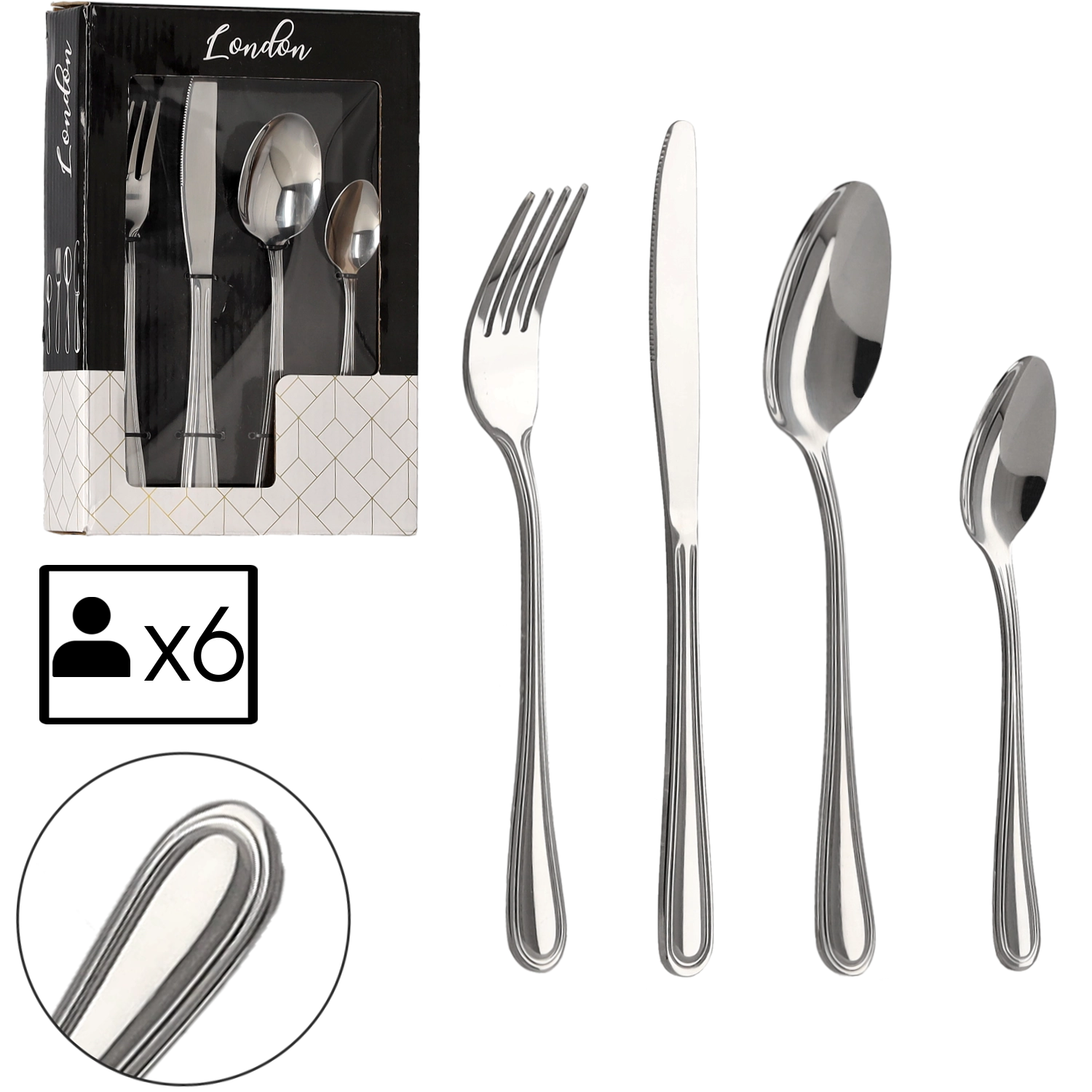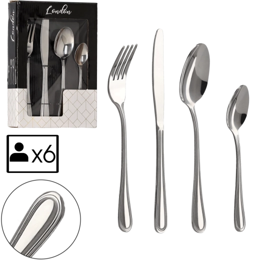 Az elegáns London evőeszközkészlet 24 darabbal érkezik, a mindennapi étkezésekhez és ünnepi alkalmakhoz egyaránt. A csomag tartalma: 6 kés, 6 villa, 6 leveseskanál és 6 teáskanál. Időtlen, klasszikus dizájn, amely egyszerűséget, eleganciát és minőségi kidolgozást ötvöz tartós rozsdamentes acélból.