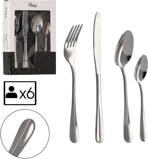 Az elegáns Paris evőeszközkészlet 6 személyre klasszikus dizájnt, letisztult eleganciát és minőségi kivitelezést kínál. Tartalmaz 6 kést, 6 villát, 6 leveseskanalat és 6 teáskanalat – ideális a mindennapi étkezésekhez és az ünnepi alkalmakhoz is.