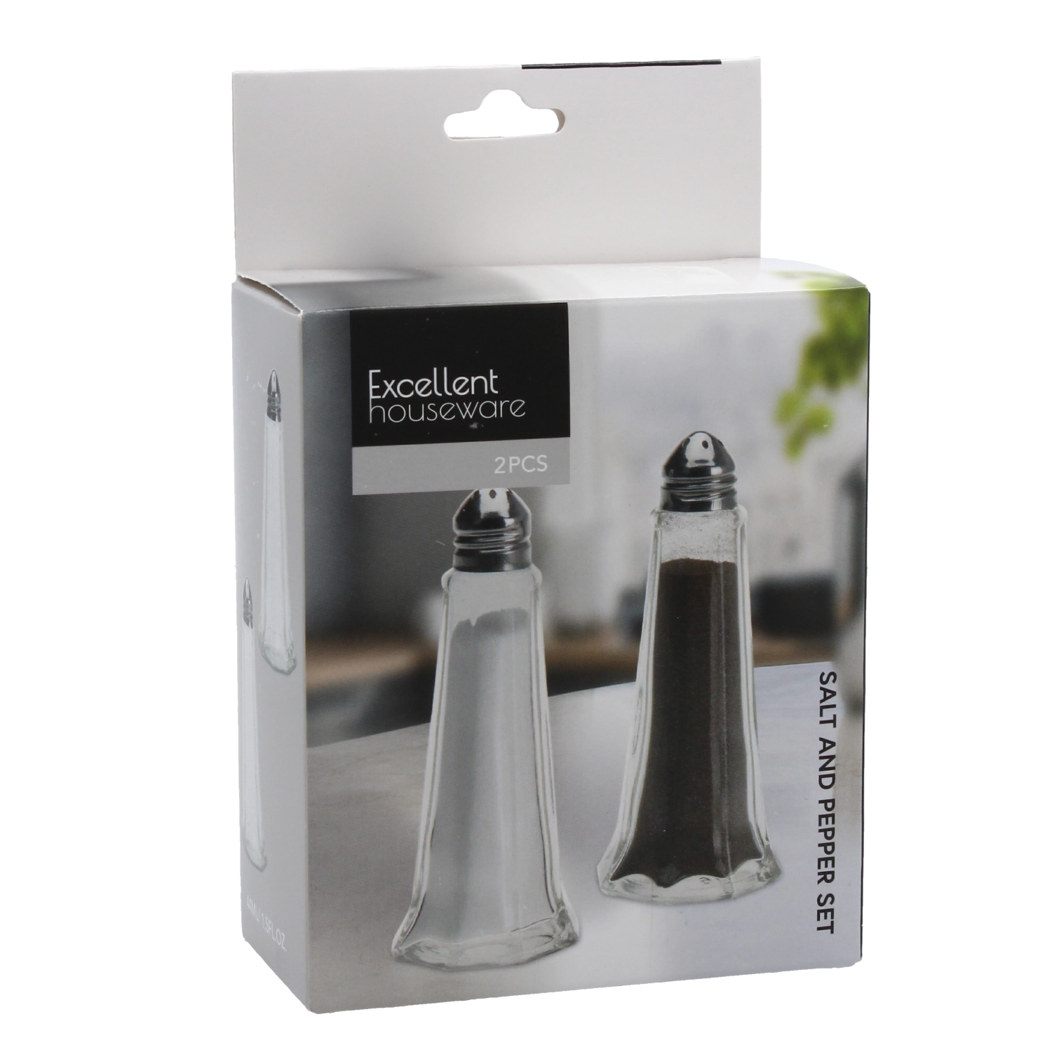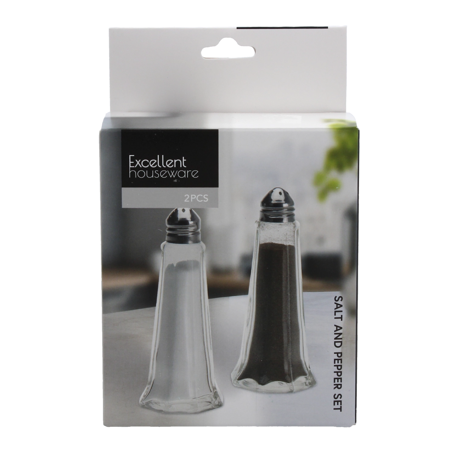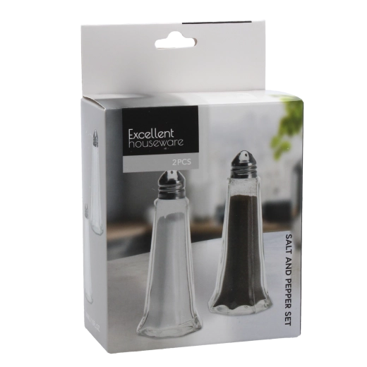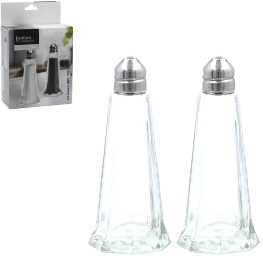Elegáns üveg só- és borsszóró készlet, ideális a mindennapi étkezéshez otthon és a vendéglátásban. Minden tartály minőségi, vastag üvegből készült, tartós, könnyen újratölthető, és az átlátszó testnek köszönhetően mindig látható a fűszerek állapota. Hat nyílással ellátott fém fedél biztosítja az egyenletes adagolást, a kompakt méretek pedig helytakarékosságot nyújtanak az asztalon és a rendezőkben.