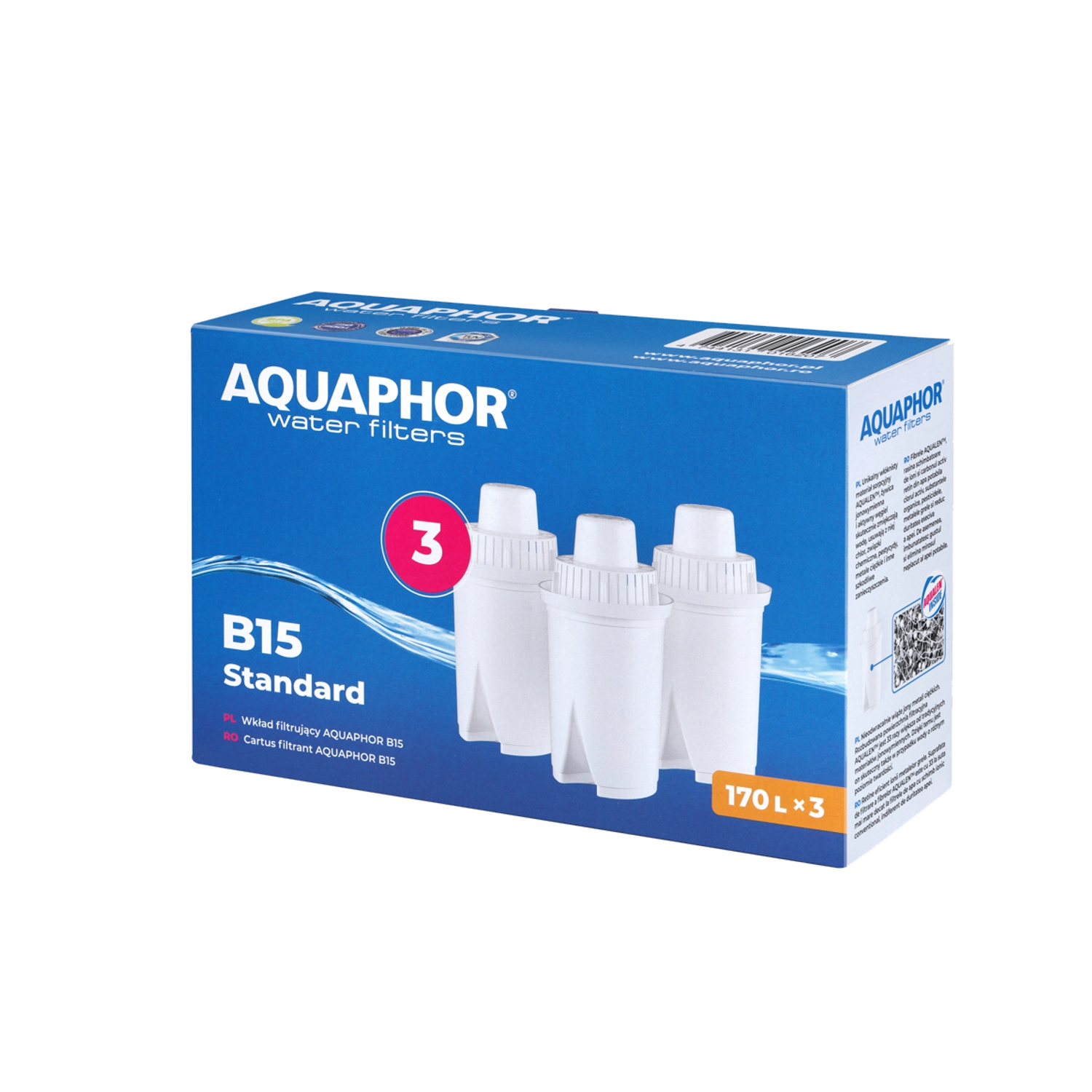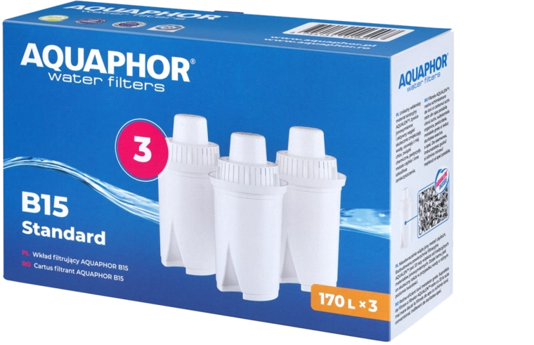 Az univerzális, három darabos AQUAPHOR B15 Standard szűrőbetét-készlet az egész család számára tiszta és ízletes csapvizet biztosít. A Aqualen szálaknak köszönhetően hatékonyan eltávolítja a klórt, a nehézfémeket, a peszticideket és a fenolokat, javítja a víz színét, ízét és illatát, valamint segít csökkenteni a vízkőképződést vízforralókban és kávéfőzőkben. Egy betét akár 170 l kapacitással rendelkezik, és kompatibilis számos kerek patronos kancsóval.