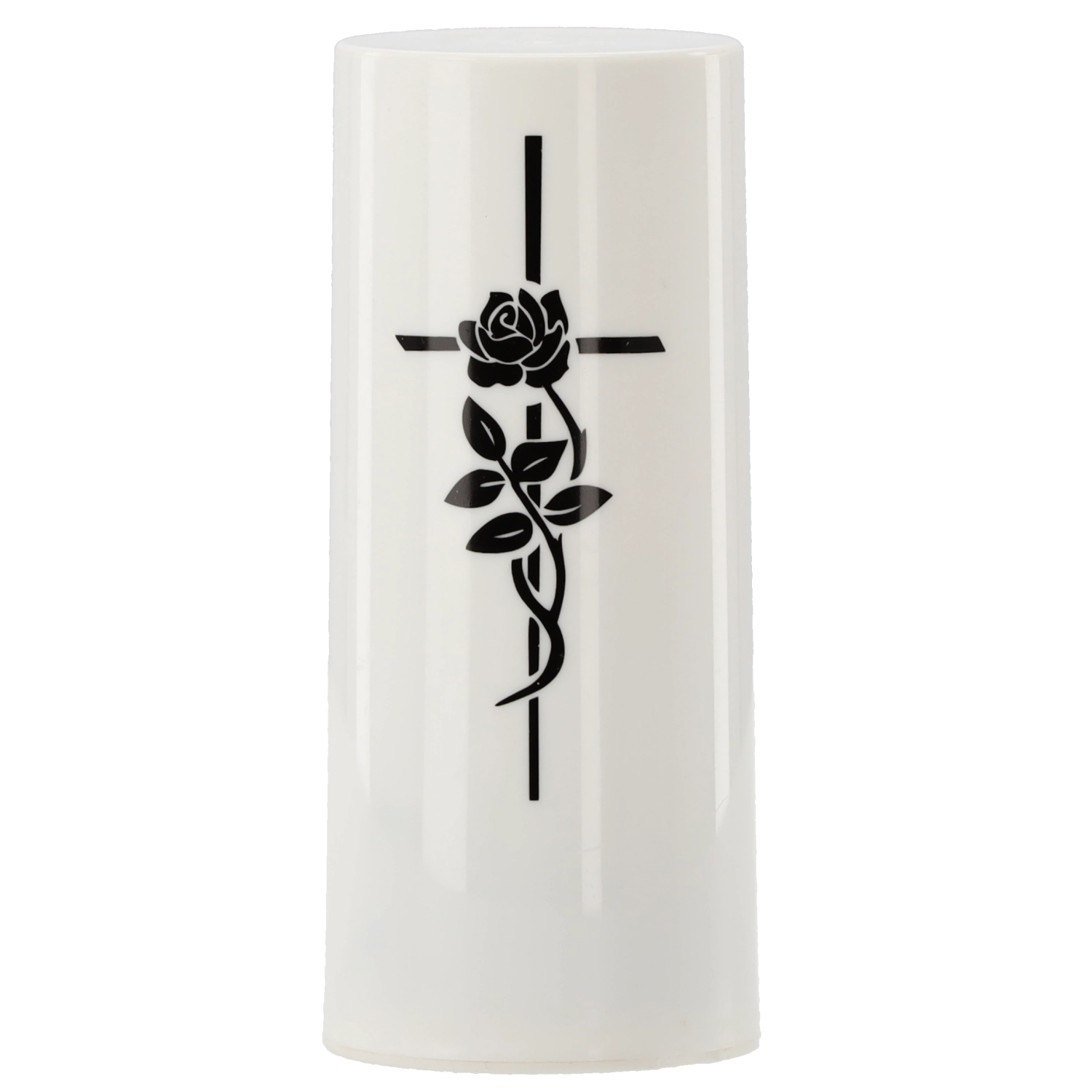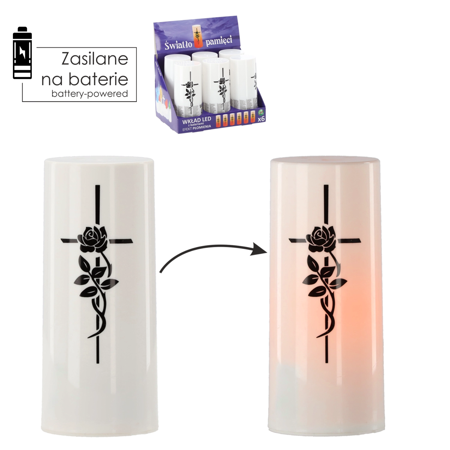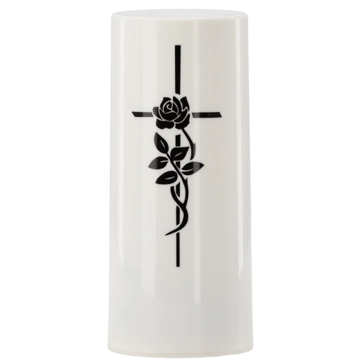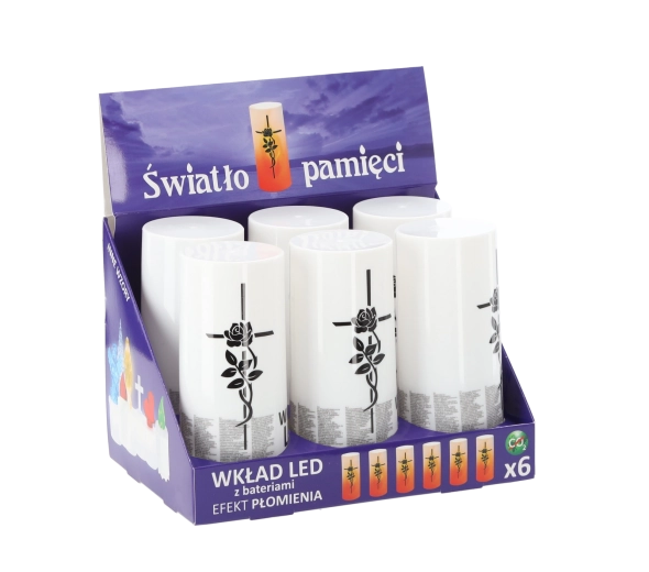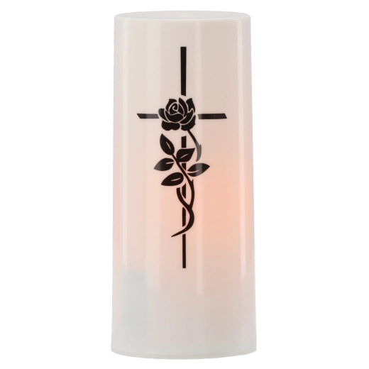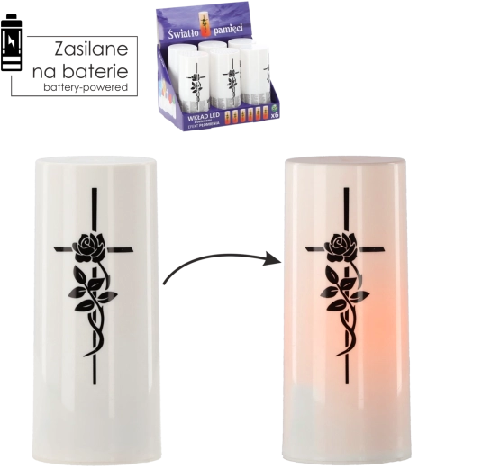 Az élőláng-hatással és diszkrét kereszttel ellátott LED betét elegáns és környezetbarát alternatívája a paraffin- vagy olajgyertyáknak. A meleg fehér fény élethűen imitálja a pislákoló lángot, amely füst és korom nélkül teremt nyugalmat és kegyeleti hangulatot. Elemről működve ideális temetői mécsesekhez, otthoni lámpásokhoz és beltéri dekorációkhoz.