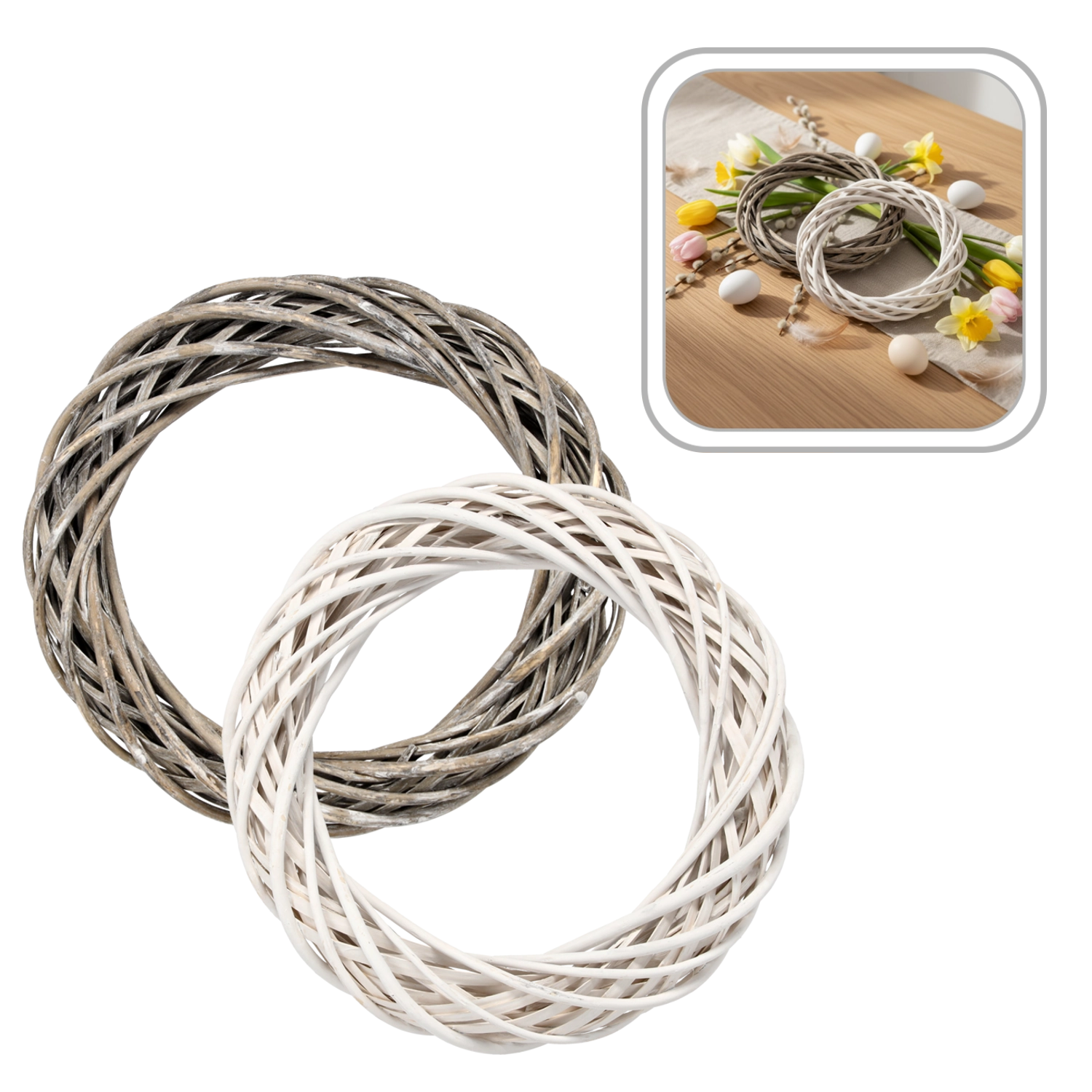 A kézműves gyártásnak és a szorosan font vesszőnek köszönhetően a koszorú tartós, formastabil, és hosszú távon is megőrzi természetes megjelenését. A semleges fehér és szürke szín könnyen kombinálható különféle színekkel és stílusokkal – a hagyományos vidékitől a modern minimalizmusig.