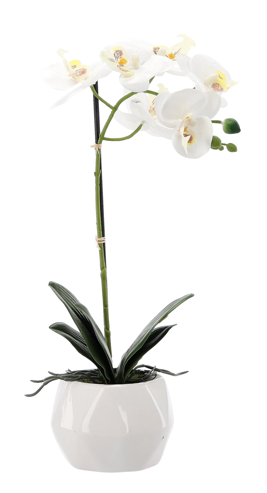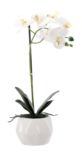 Vigyen eleganciát otthonába vagy irodájába egy orchideával, amely élethűnek hat, mégsem igényel semmilyen karbantartást. A realista részletek természetes megjelenést biztosítanak, míg a fehér kaspó kiemeli a modern stílust, és könnyedén illeszkedik bármely belső térhez.