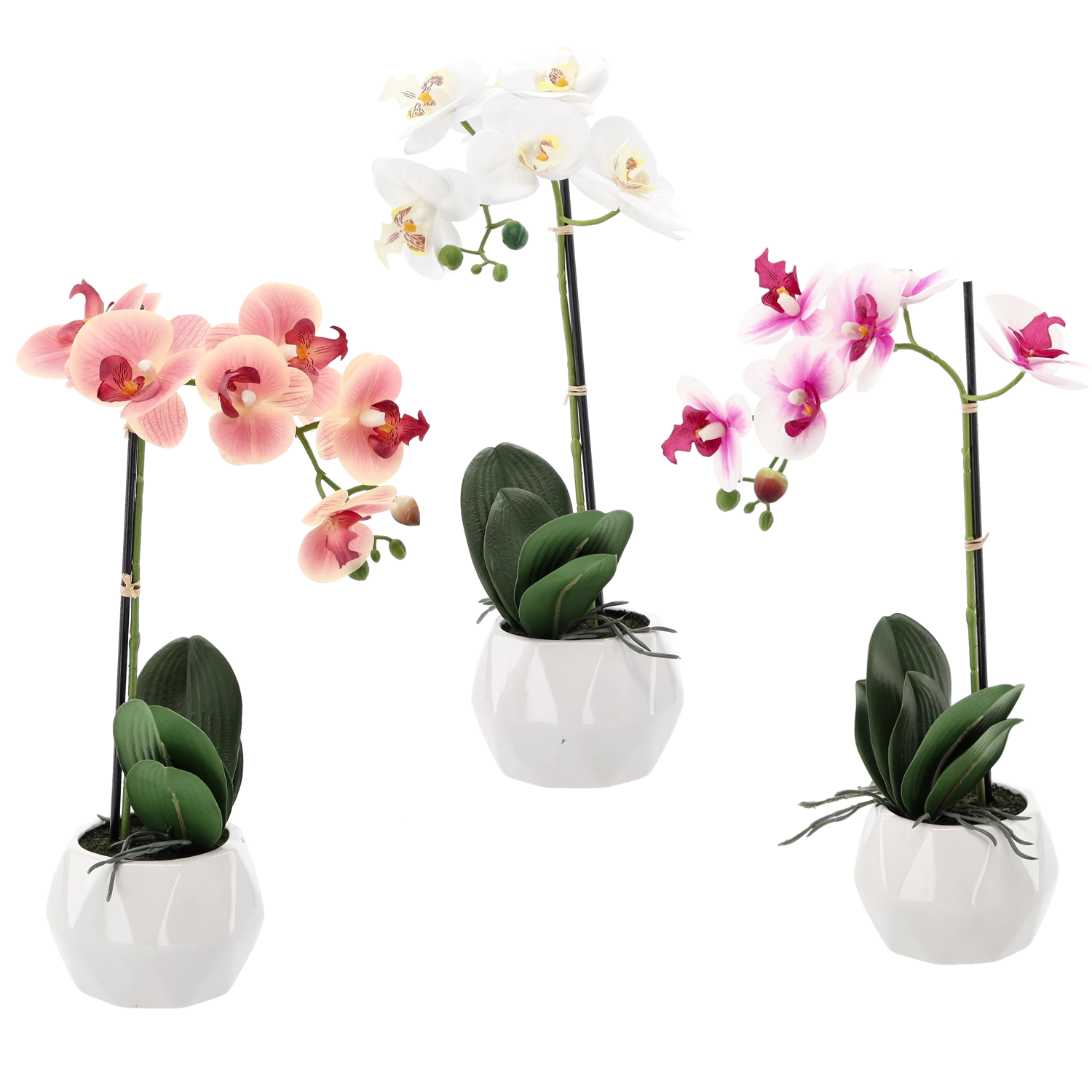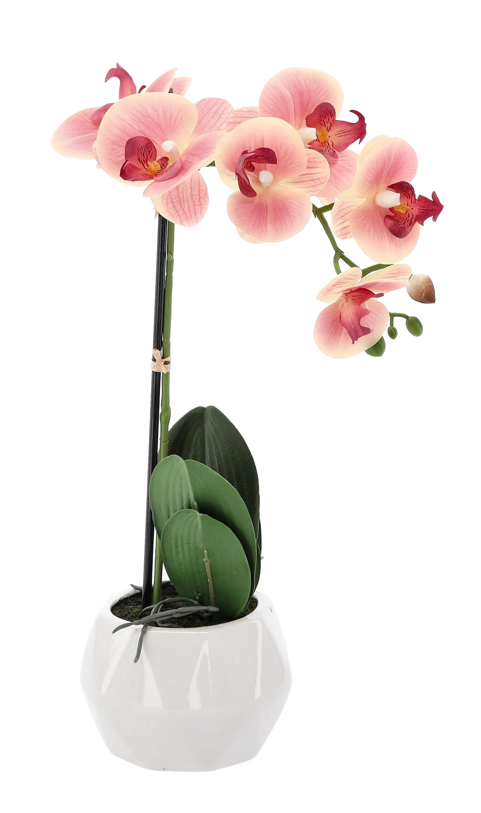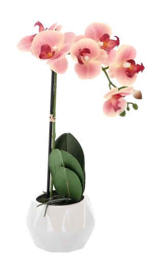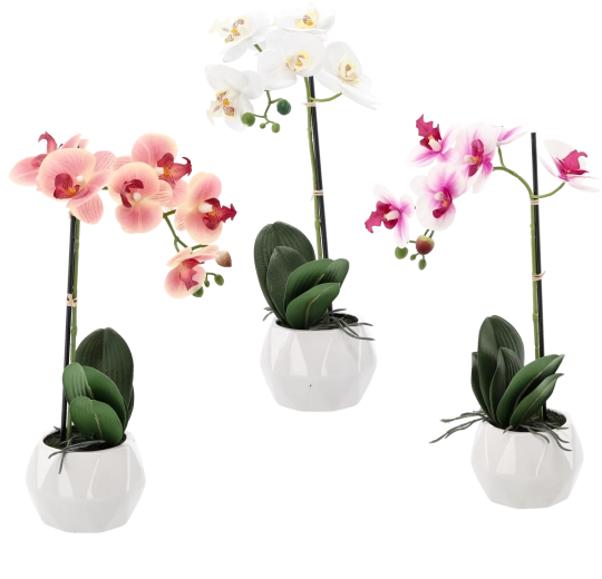 Elegáns 42 cm magas mű orchidea 3 szín (fehér, rózsaszín, sárgabarack) mixében, amely gondozás nélkül illik bármely enteriőrbe. A csomag része egy stílusos fehér kaspó és a virágok, illetve levelek élethű kidolgozása a természetes megjelenésért egész évben.