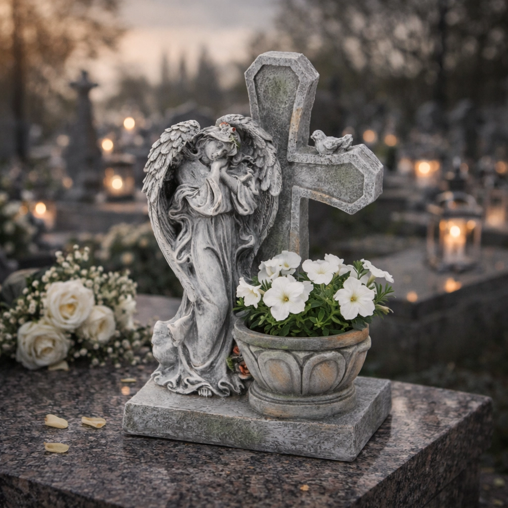 A szobor ideális sírra, emlékműre vagy kerti zugba. A virágtartó élő vagy művirág elhelyezését teszi lehetővé, ezáltal erősítve a személyes megemlékezést és a hit szimbólumát.