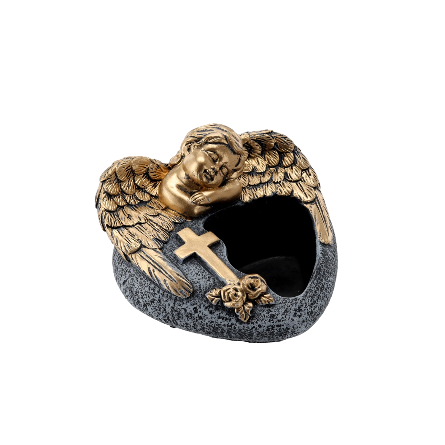 Stílusos dekorációval tiszteleghet szerettei emléke előtt. Ez a szív alakú, cementből készült virágtartó kis angyallal ideális temetői díszekhez és halottak napi kompozíciókhoz. A sötétszürke kivitel arany akcentusokkal ízléses és időtálló, könnyen kombinálható természetes és művirágokkal is.