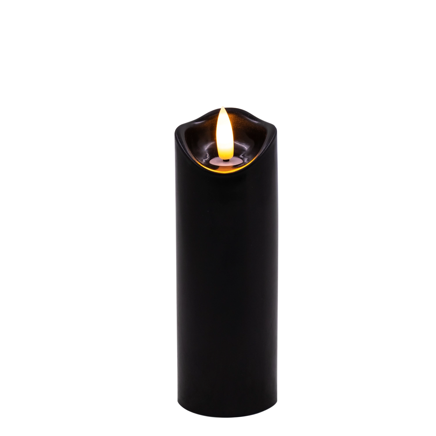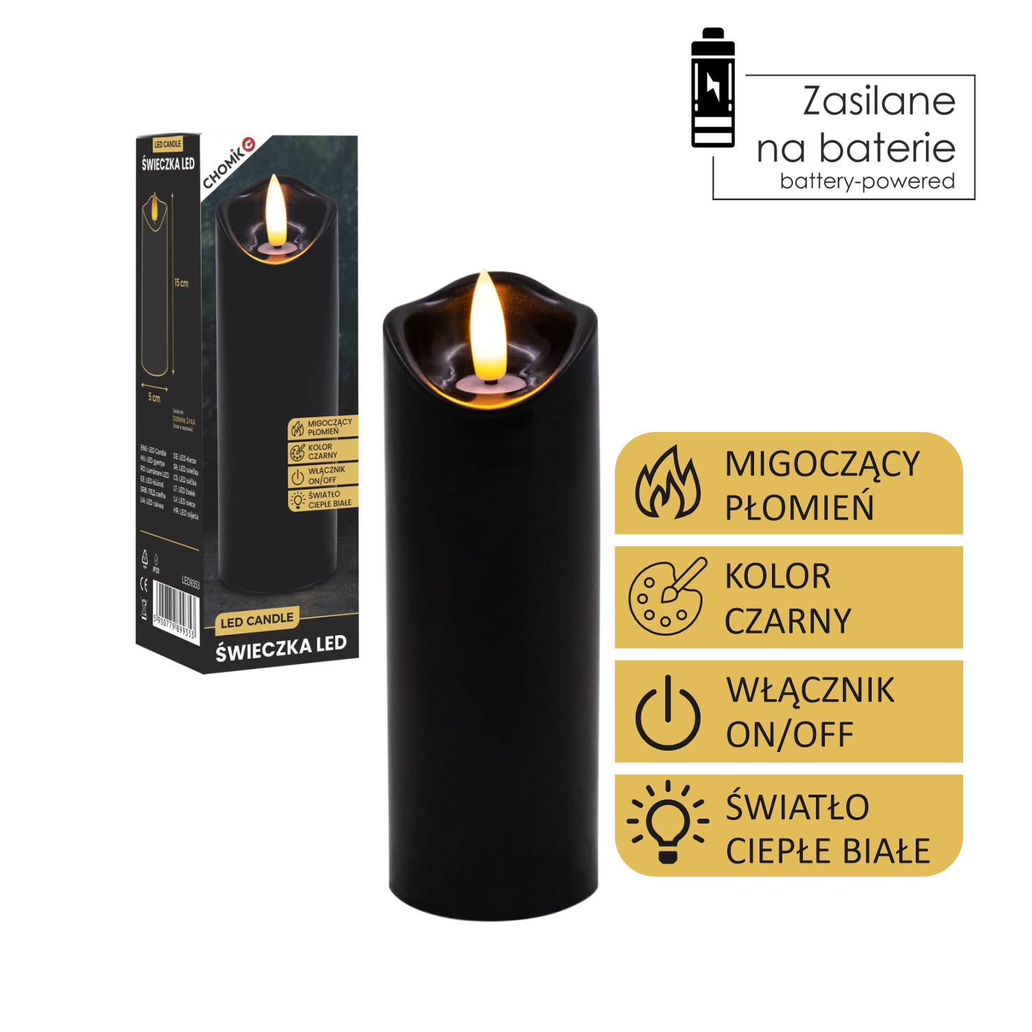 Stílusos, fekete kivitelű LED gyertya valósághű, finoman lobogó meleg fehér fénnyel. Kiválóan alkalmas beltéri dekorációnak, illetve lámpásba vagy gyertyatartóba helyezhető gyertyaként. Praktikus 2× AA elemes tápellátás (nem tartozék) és egyszerű On/Off vezérlés.