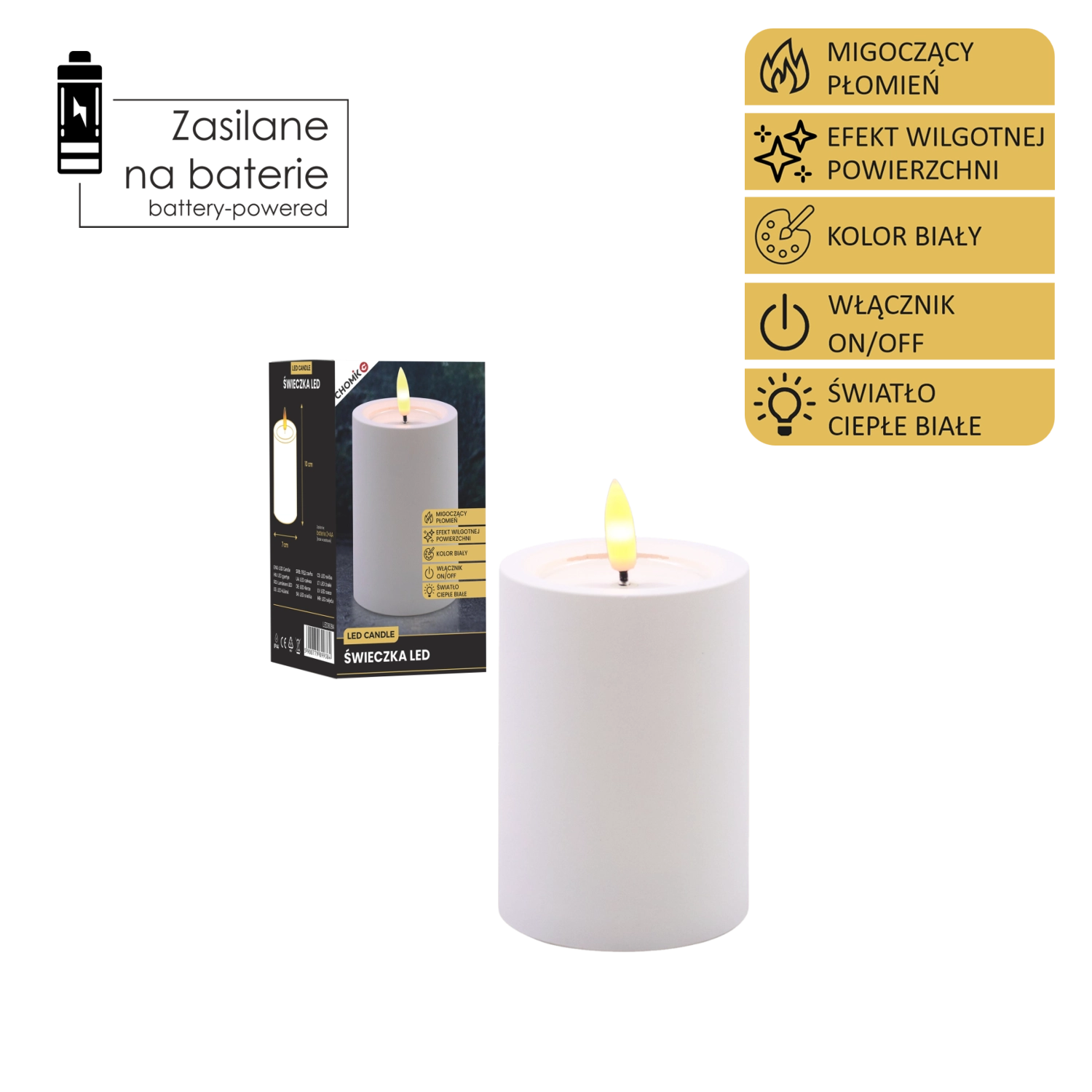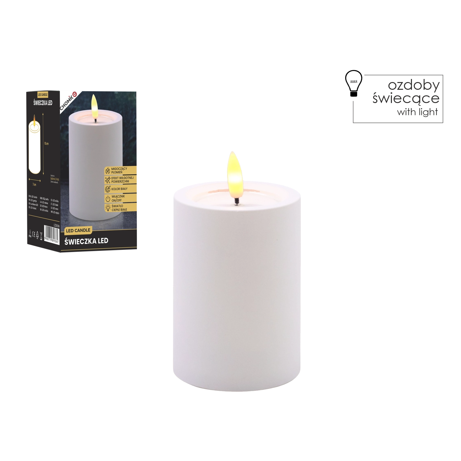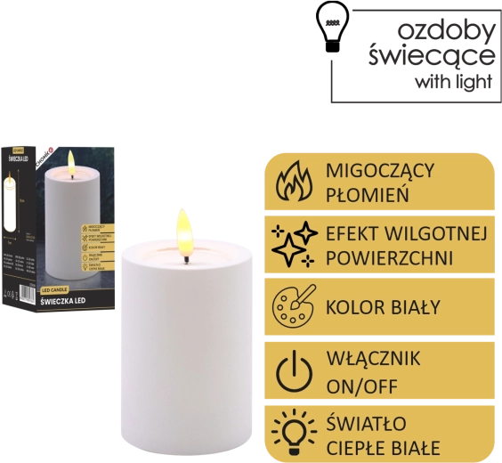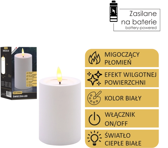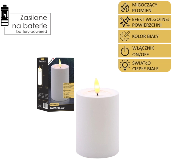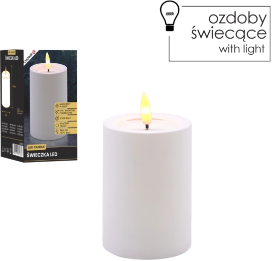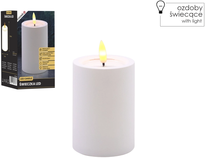 Dekoratív fehér LED gyertya 7 × 10 cm méretben, biztonságos és hangulatos fényt ad meleg fehér, pislákoló lánggal. Realista, nedves hatású felső peremmel rendelkezik, remekül illik a nappaliba, hálószobába és az ünnepi asztalra is. Láng és füst nélkül, egyszerű On/Off kapcsolóval vezérelhető, 2× AA elemmel működik (az elemek nem tartozékok).