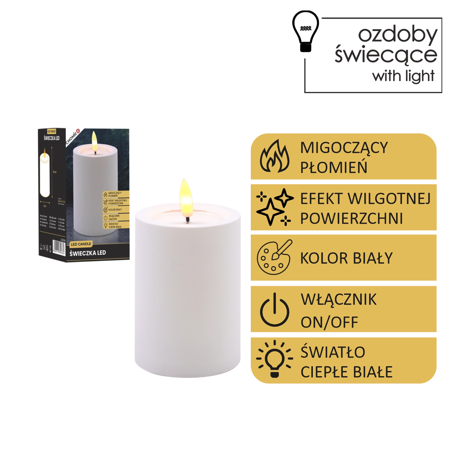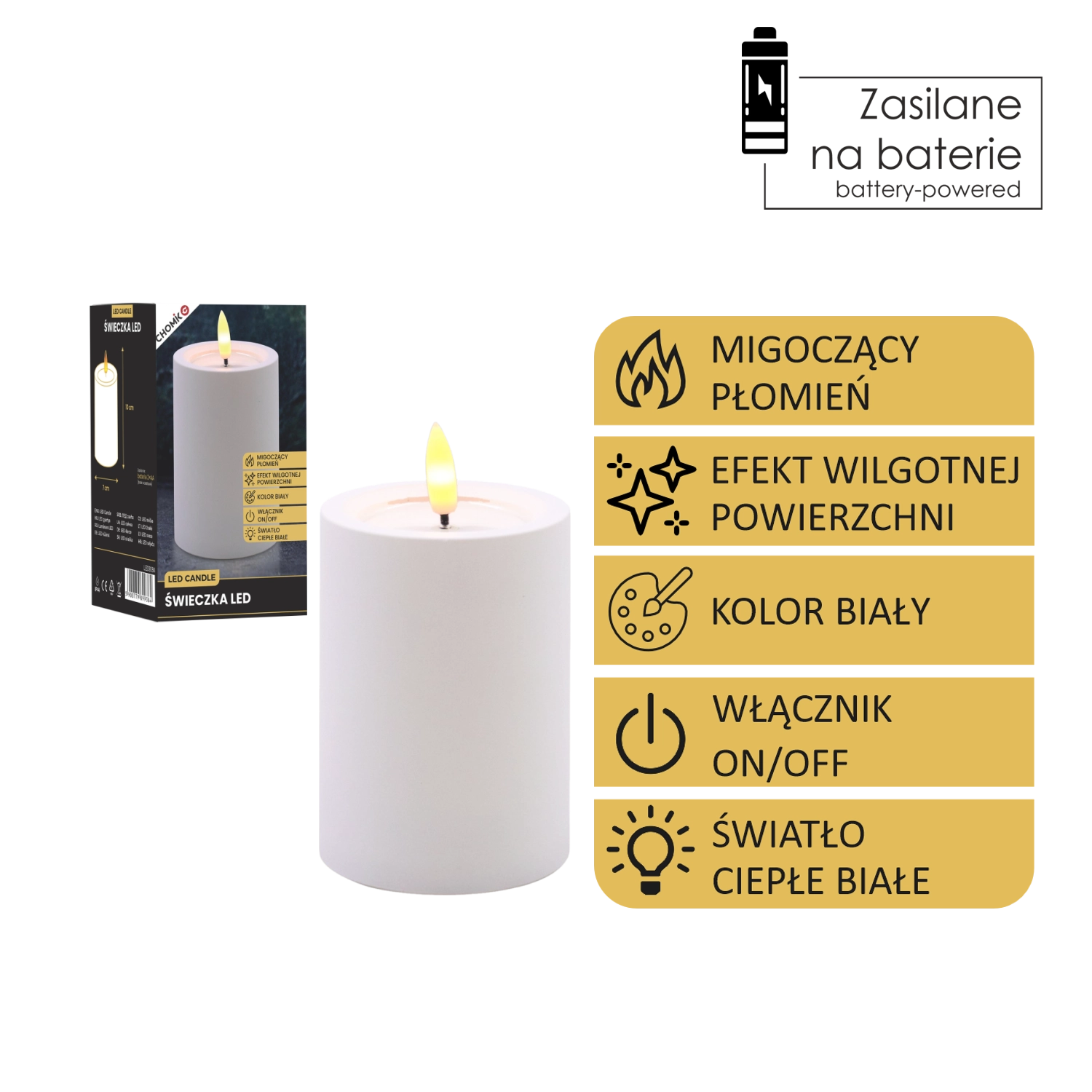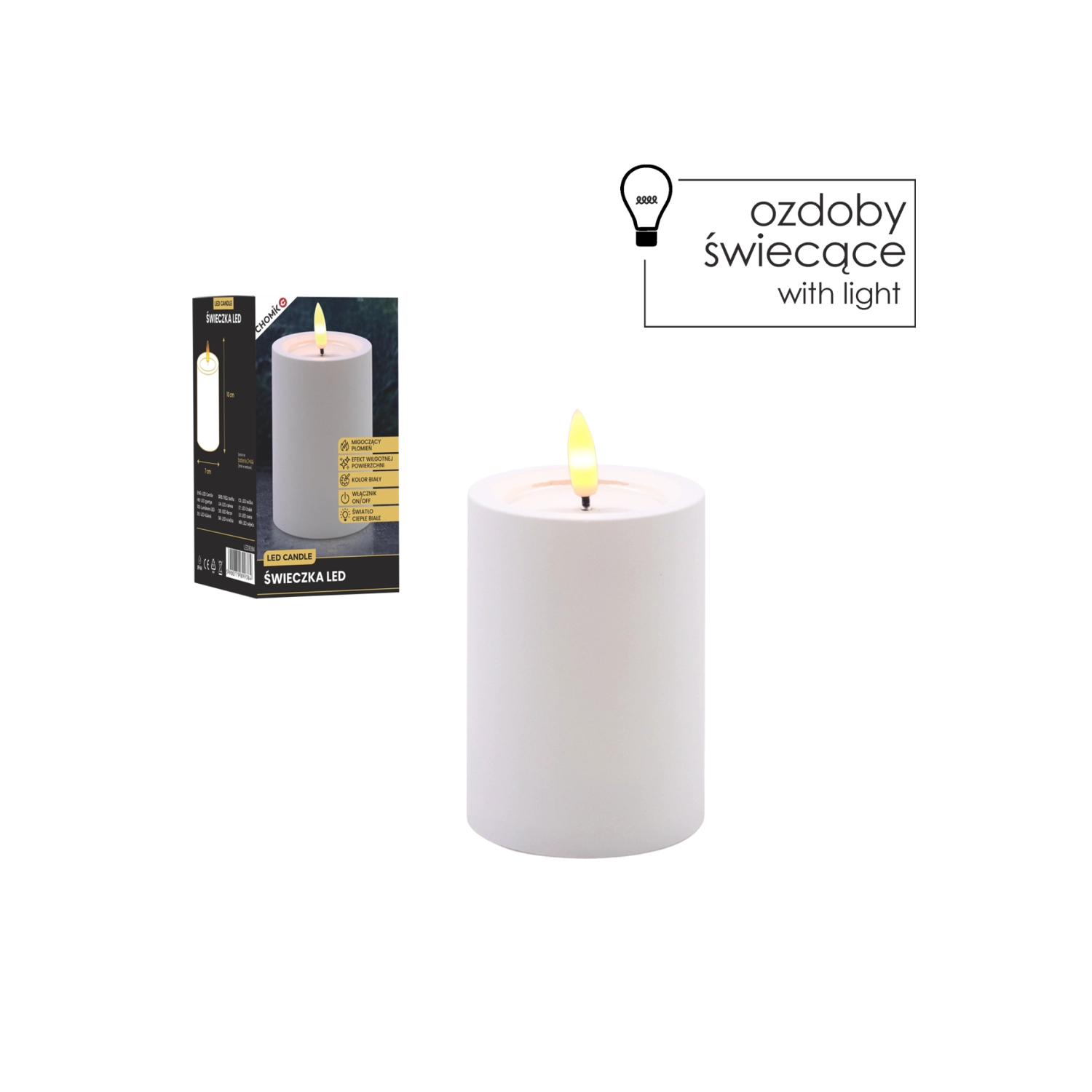Dekoratív fehér LED gyertya 7 × 10 cm méretben, biztonságos és hangulatos fényt ad meleg fehér, pislákoló lánggal. Realista, nedves hatású felső peremmel rendelkezik, remekül illik a nappaliba, hálószobába és az ünnepi asztalra is. Láng és füst nélkül, egyszerű On/Off kapcsolóval vezérelhető, 2× AA elemmel működik (az elemek nem tartozékok).