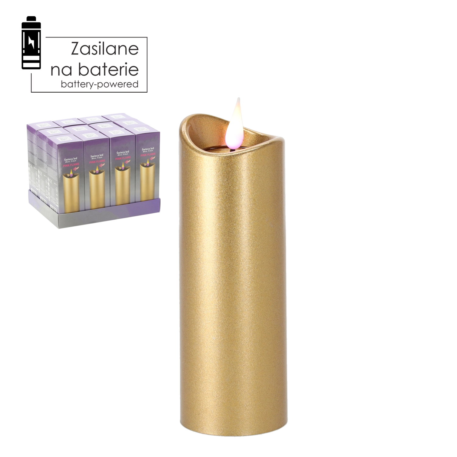 LED gyertya 5 × 15 cm arany, rózsaszín lánggal, elemmel a csomagban