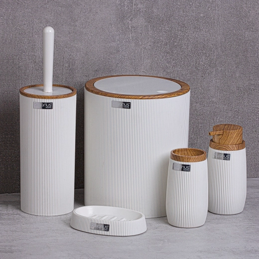 Stílusos, öt részes fürdőszobai szett fehér színben, elegáns fa hatású elemekkel, strapabíró műanyagból a mindennapokra. Tartalmaz mindent, ami egy rendezett és higiénikus fürdőszobához szükséges: szemetes, WC-kefe, szappanadagoló, fogkefetartó pohár és szappantartó.