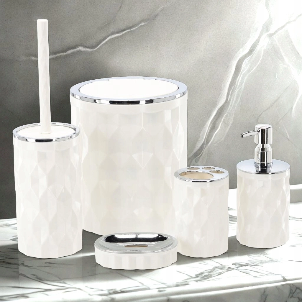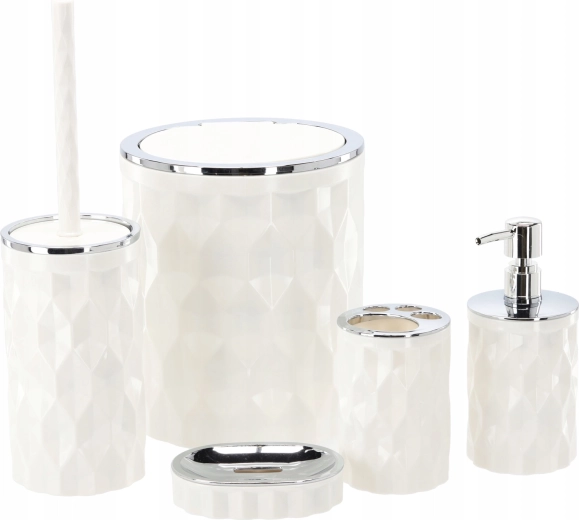 Stílusos, ötrészes fürdőszobai kiegészítő szett elegáns fehér színben, amely mindent biztosít a mindennapi higiéniához és rendre. Az egységes, modern részletekkel ellátott dizájnnak és a praktikus elrendezésnek köszönhetően tiszta, összehangolt fürdőszobaképet és könnyű karbantartást kap. A szett tartalma: szemetes, WC-kefe tartóval, folyékony szappan adagoló, fogkefetartó és szappantartó.
