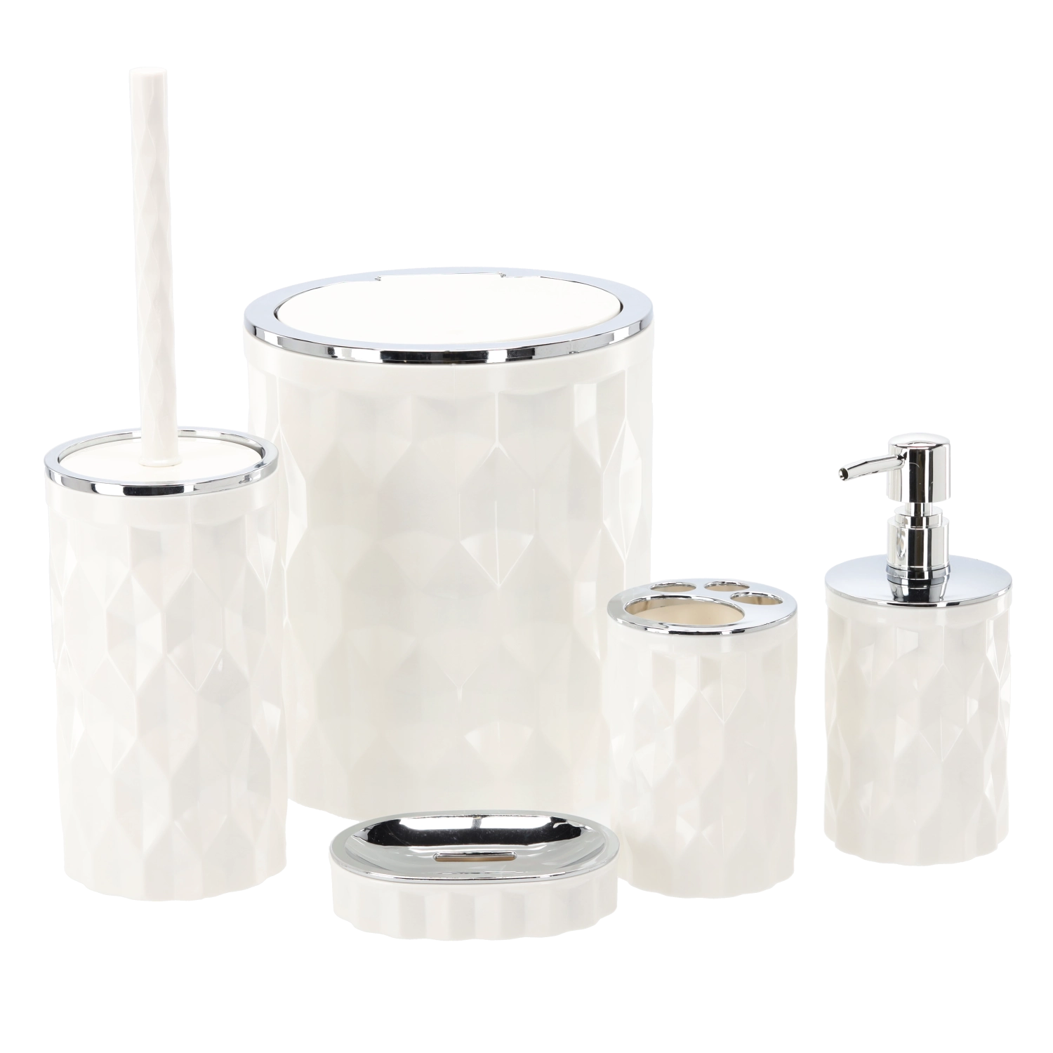 Öt alapvető kiegészítő egységes dizájnban: szemetes, WC-kefe, szappanadagoló, fogkefetartó és szappantartó. Ideális kezdőcsomag minden fürdőszobába.