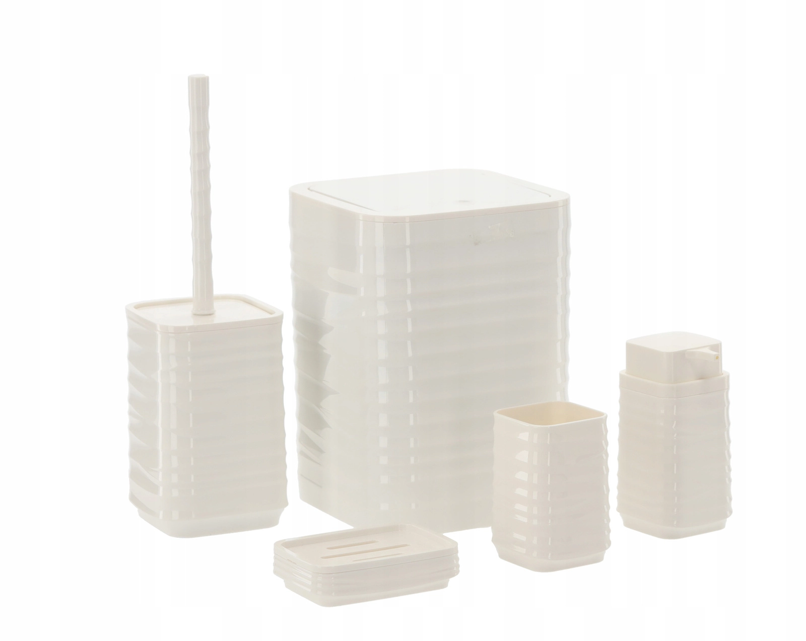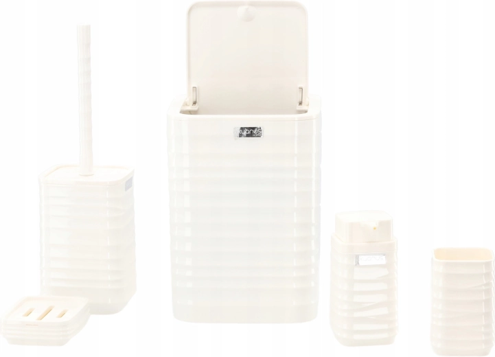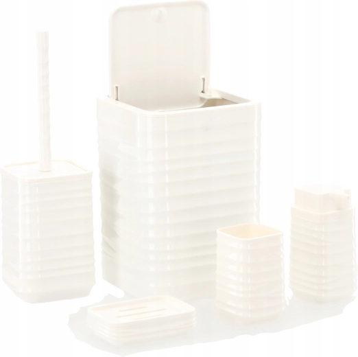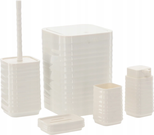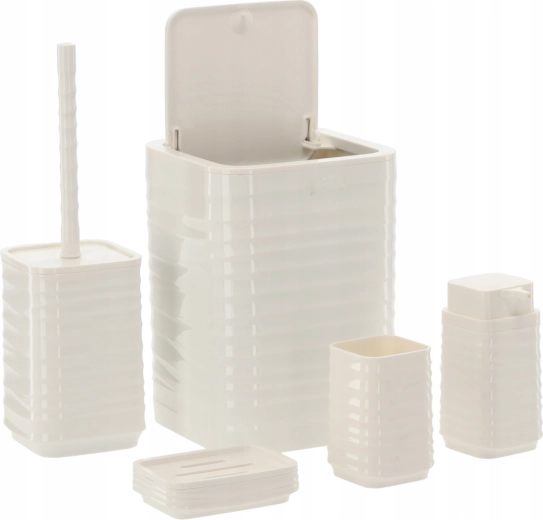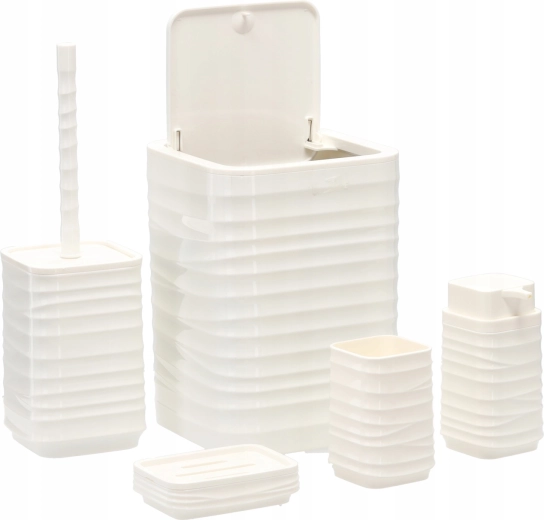 Elegáns, 5 részes fürdőszobai szett fehér színben, amely egységesíti fürdőszobája megjelenését és megkönnyíti a mindennapi higiéniát. A modern, bordázott, négyzetes designnak és a könnyen tisztítható műanyagnak köszönhetően praktikus felszerelést kap: szemetes, WC-kefe, szappanadagoló, fogkefetartó pohár és szappantartó.