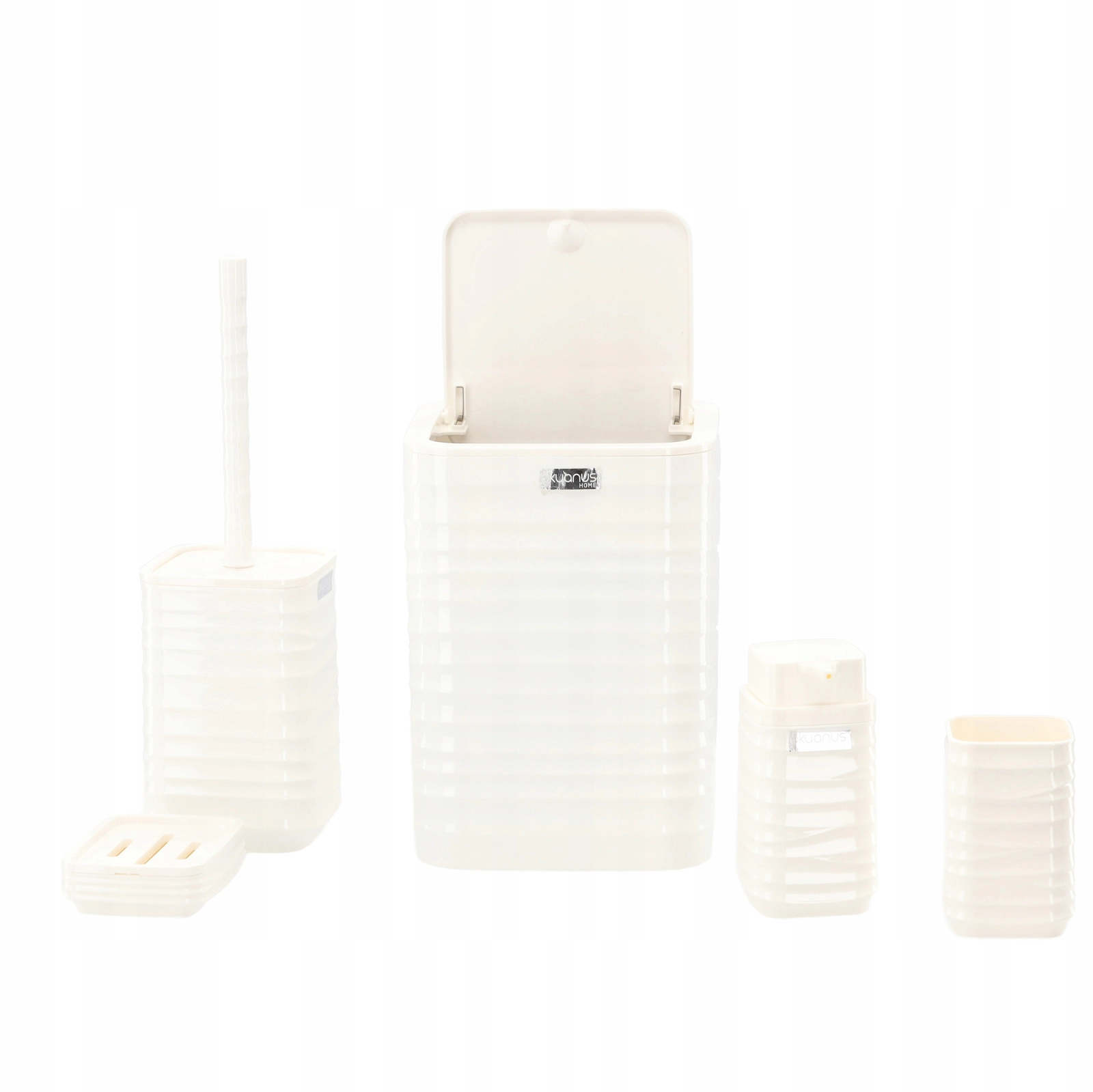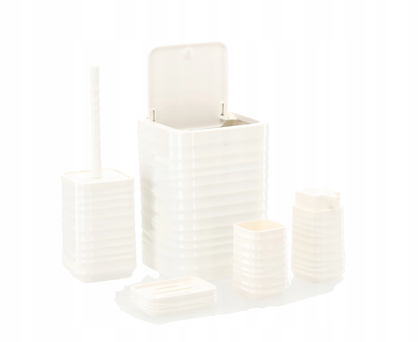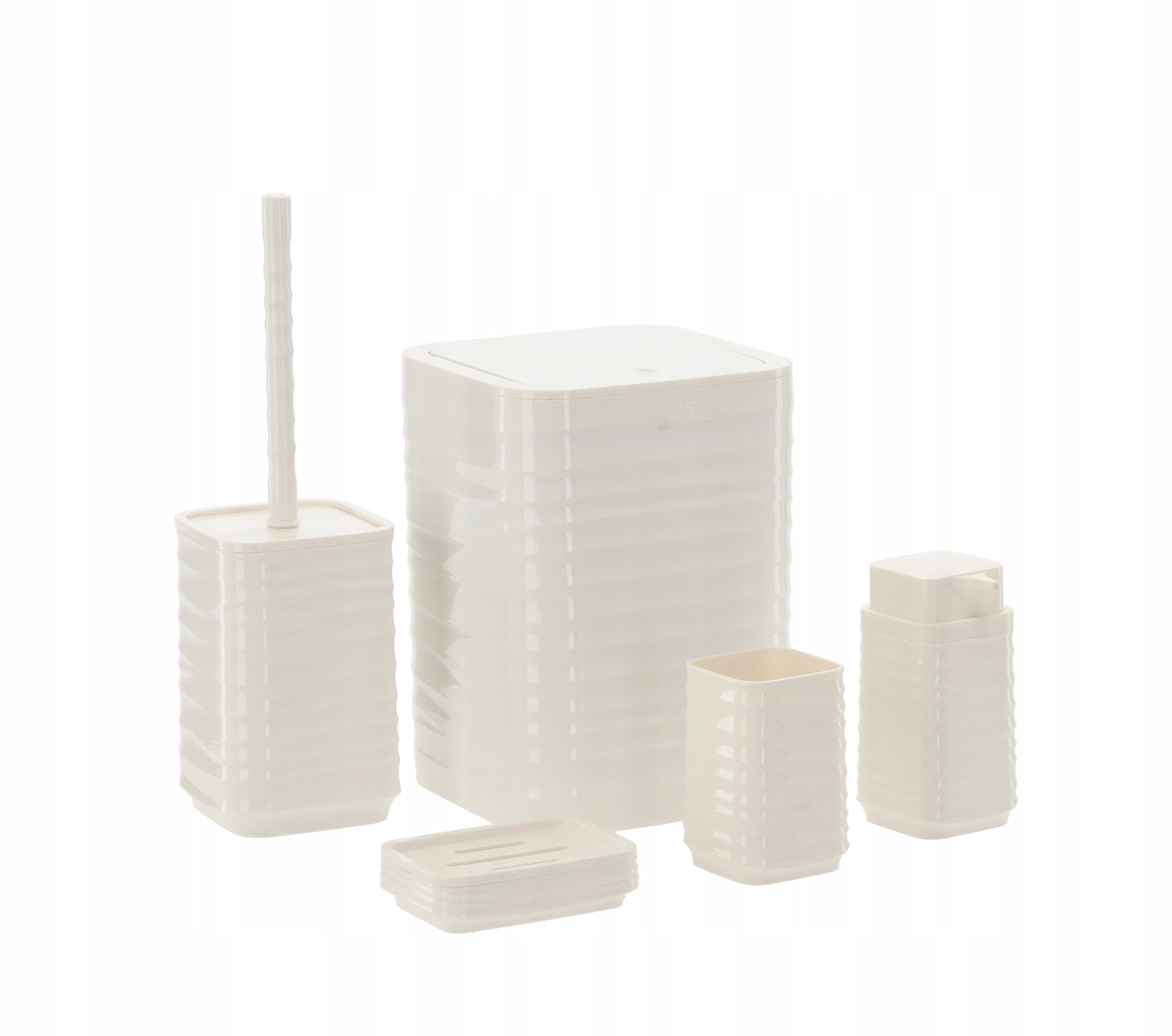 Elegáns, 5 részes fürdőszobai szett fehér színben, amely egységesíti fürdőszobája megjelenését és megkönnyíti a mindennapi higiéniát. A modern, bordázott, négyzetes designnak és a könnyen tisztítható műanyagnak köszönhetően praktikus felszerelést kap: szemetes, WC-kefe, szappanadagoló, fogkefetartó pohár és szappantartó.