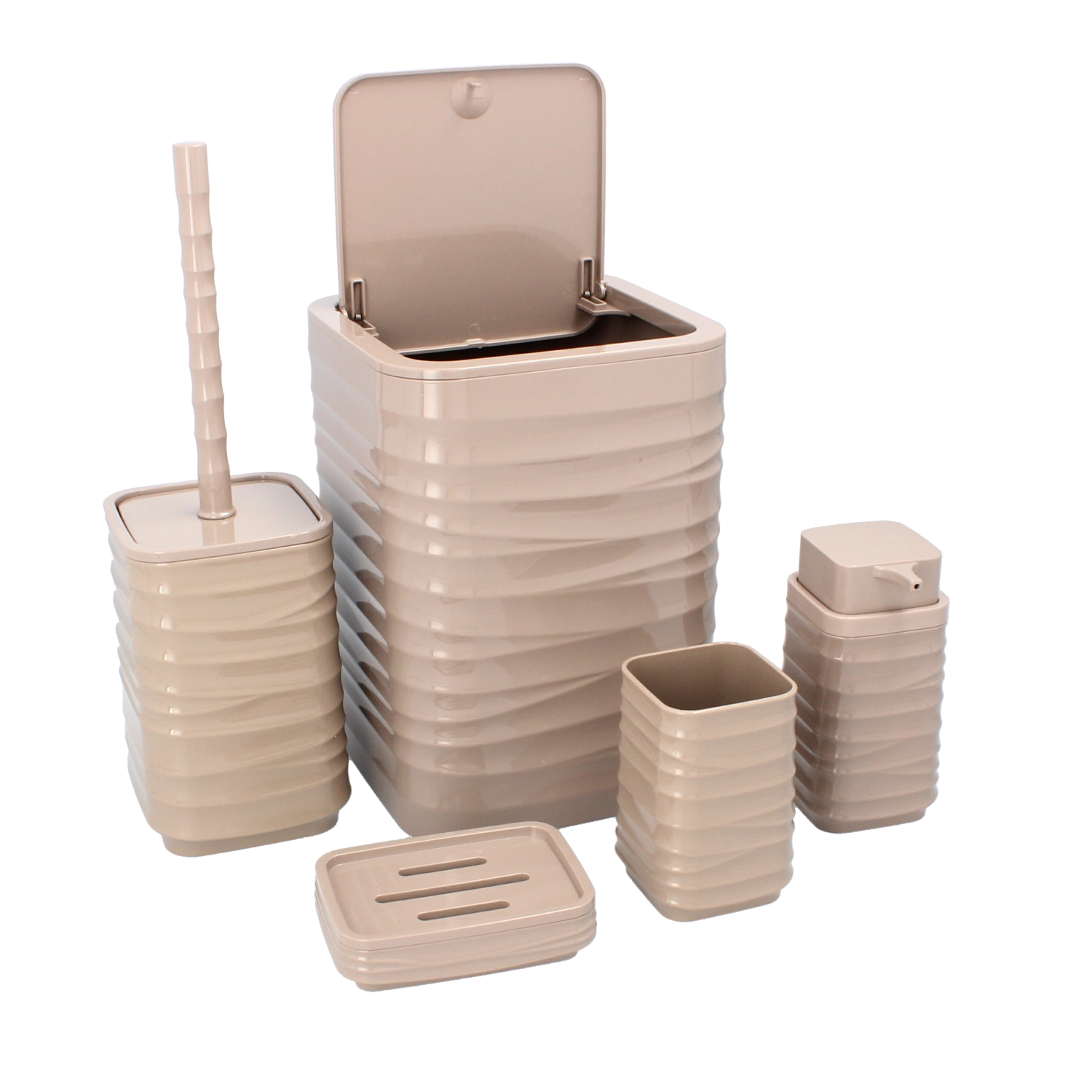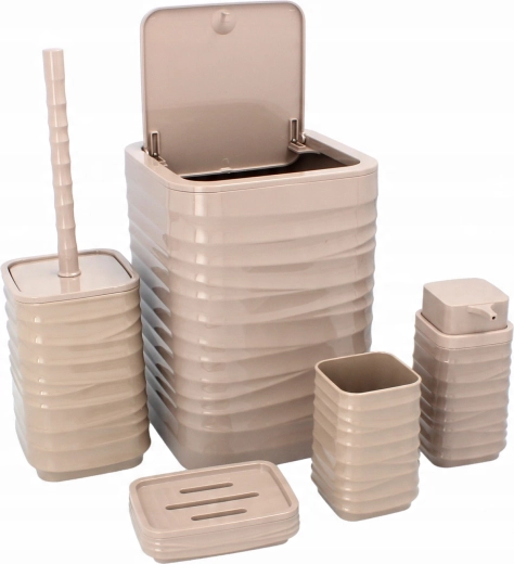 Stílusos, tartós műanyagból készült fürdőszobai szett elegáns barna színben, amely egységesíti az egész fürdő megjelenését. Tartalmaz egy szelektív szemetes kukát, egy WC-kefét tartóval, egy szappanadagolót, egy fogkefetartó poharat és egy szappantartót. A praktikus, négyzetes kialakítás barázdált struktúrával helytakarékos és könnyen tisztítható.