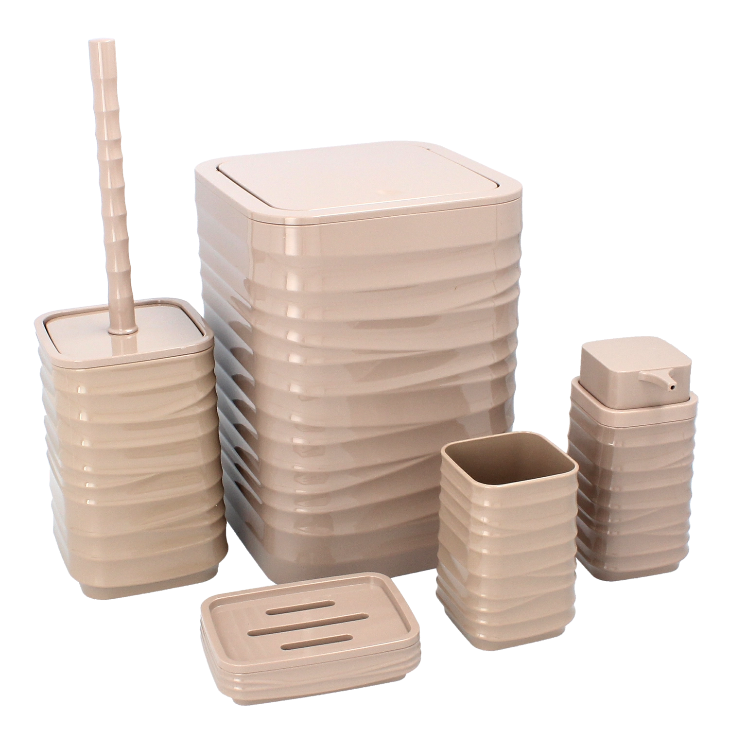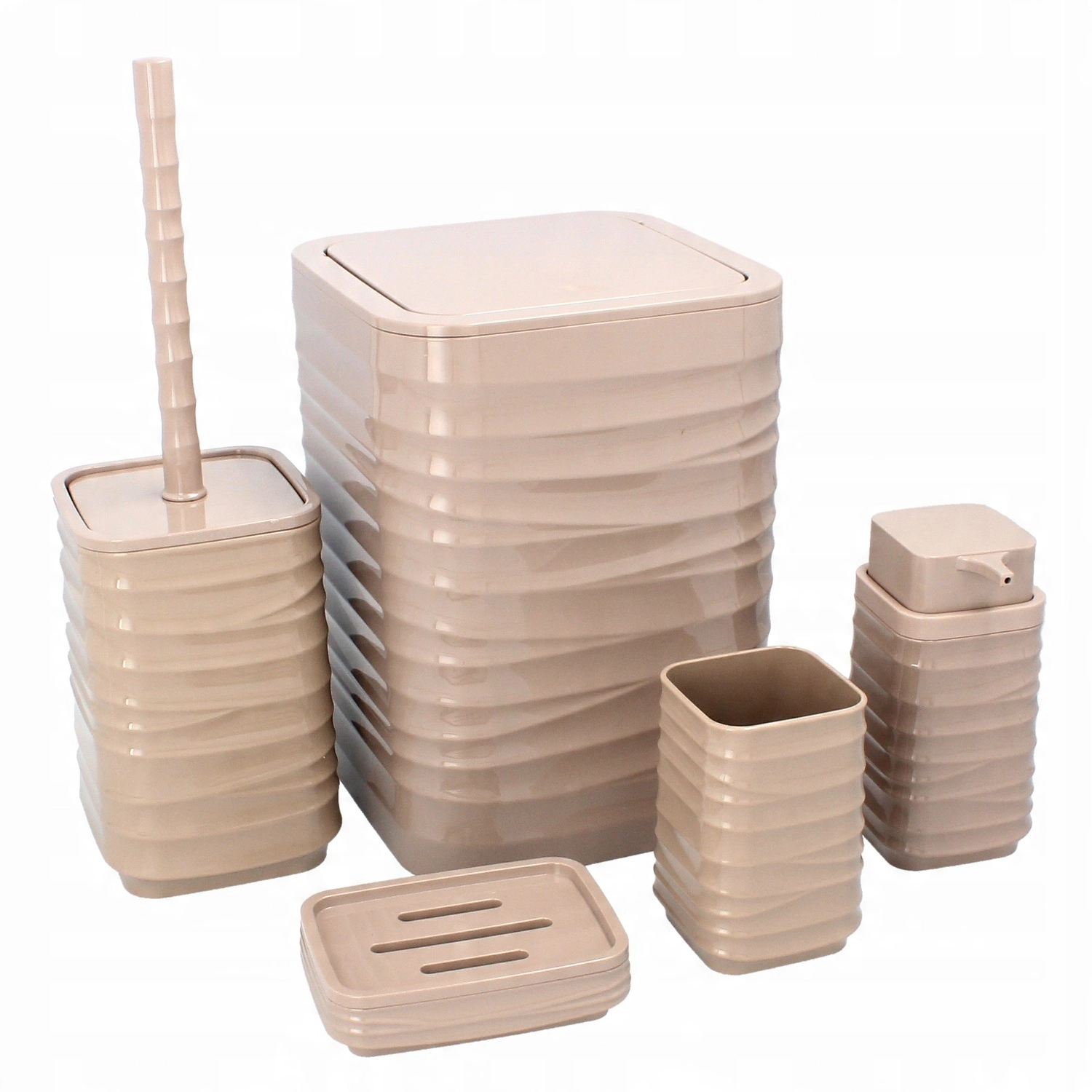 Ez a teljes, 5 részes fürdőszobai szett barna kivitelben ideális azok számára, akik összehangolt kiegészítőket szeretnének és rendet tartanának. A tartós műanyag kialakítás megkönnyíti a karbantartást és hosszú élettartamot biztosít, míg a modern, négyzetes forma finom barázdálással kifinomult megjelenést ad a fürdőnek.