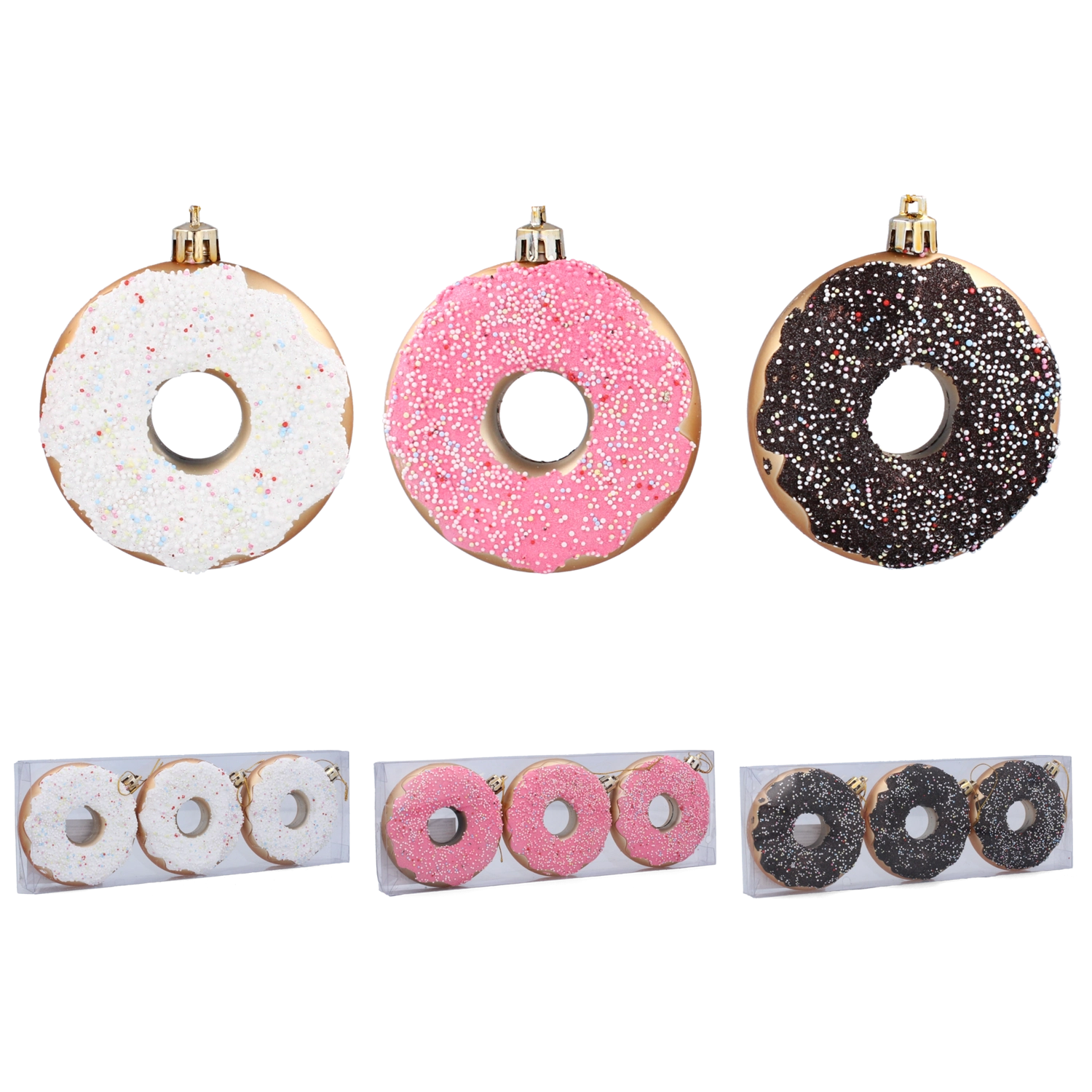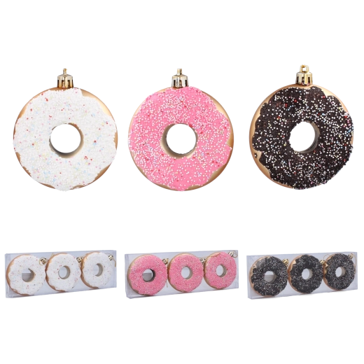 Stílusos, három darabos karácsonyi díszkészlet 8 cm átmérőjű fánkok formájában, amely eredeti alternatívája a klasszikus gömböknek. A gondos kidolgozásnak köszönhetően szépen kiemeli a karácsony varázsát, és sokoldalú dekorációként illik bármilyen stílusú díszítéshez.