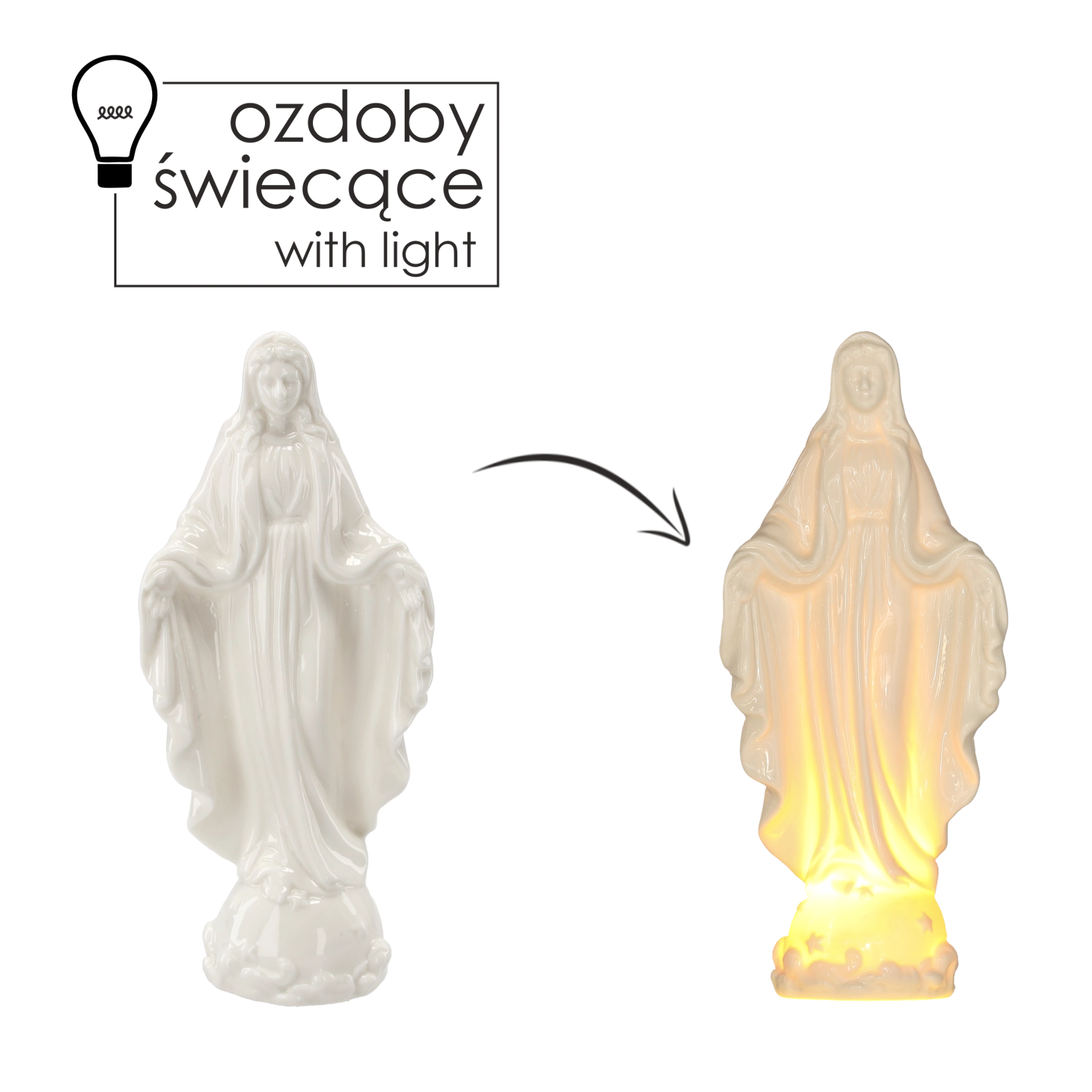 Elegáns, 23,5 cm magas Szűz Mária figura beépített LED világítással, amely a belső térnek nyugodt, szakrális hangulatot kölcsönöz. A finom fény kiemeli a szobor részleteit, ideális oltárra, nappaliba vagy karácsonyi dekorációnak. Elemes táplálásának köszönhetően kábelek nélkül, könnyedén elhelyezhető.