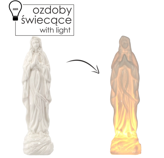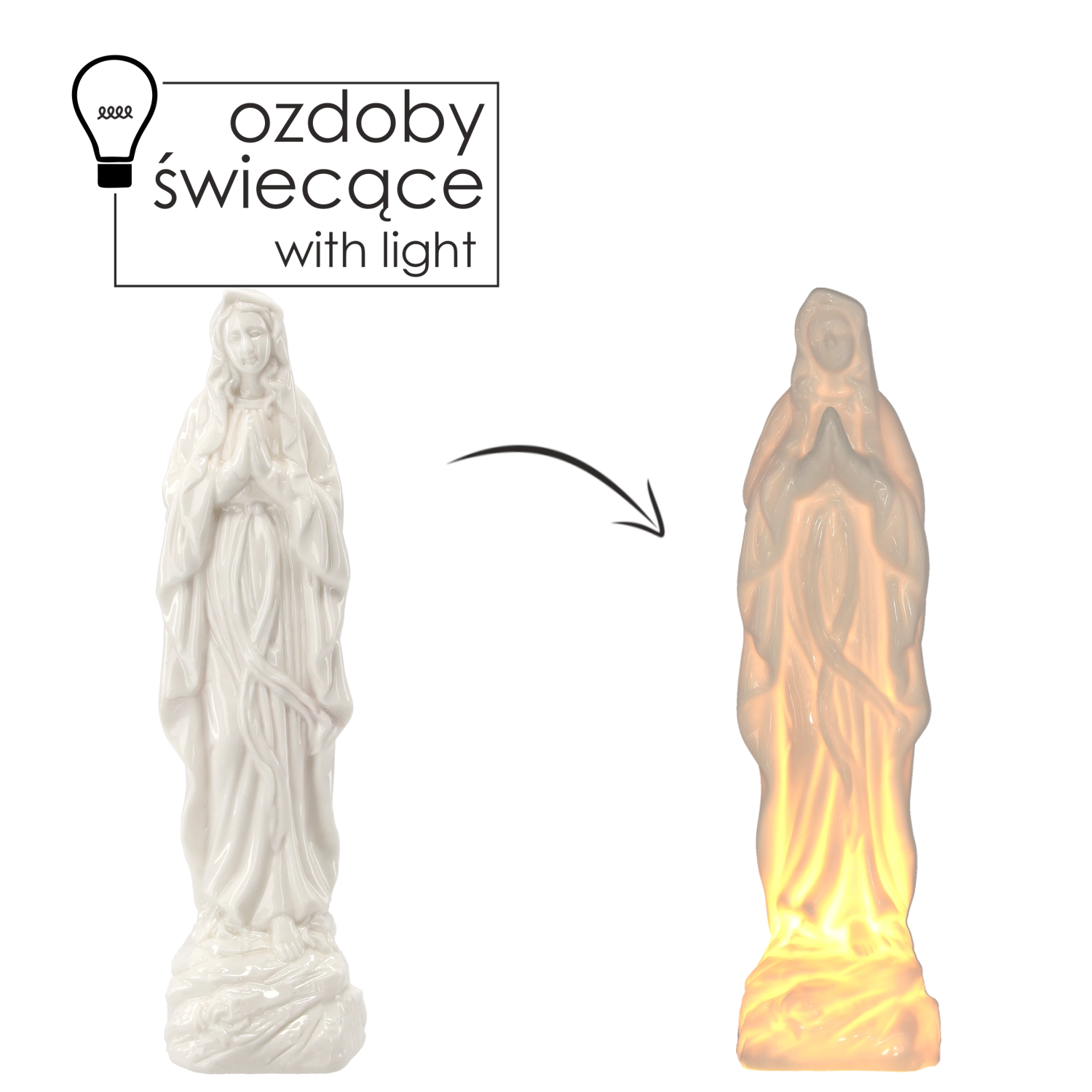 Elegáns porcelán Szűz Mária figura 28,8 cm magassággal és beépített LED világítással, amely meleg és nyugodt hangulatot teremt otthonában. Elemes működésének köszönhetően kábelek nélkül bárhová elhelyezhető, ideális karácsonyi dekorációhoz és mindennapi lelki elcsendesedéshez is.