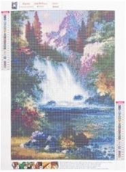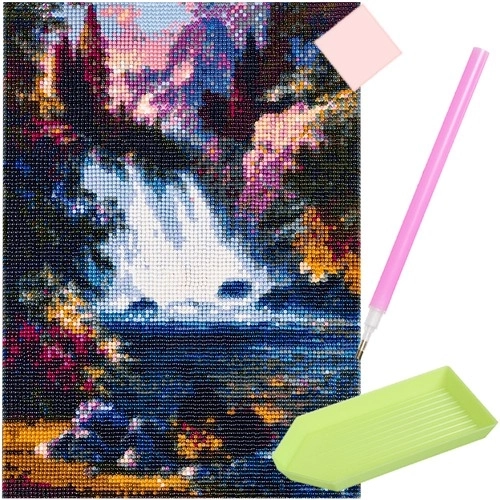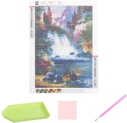 A vízesés motívum 30 × 40 cm-es méretben (a kép felülete 25 × 35 cm) a csillogó hatásnak köszönhetően igazán érvényesül, és elkészítve remekül keretezhető vagy keret nélkül is felakasztható. A készlet teljes – minden azonnal kéznél van.