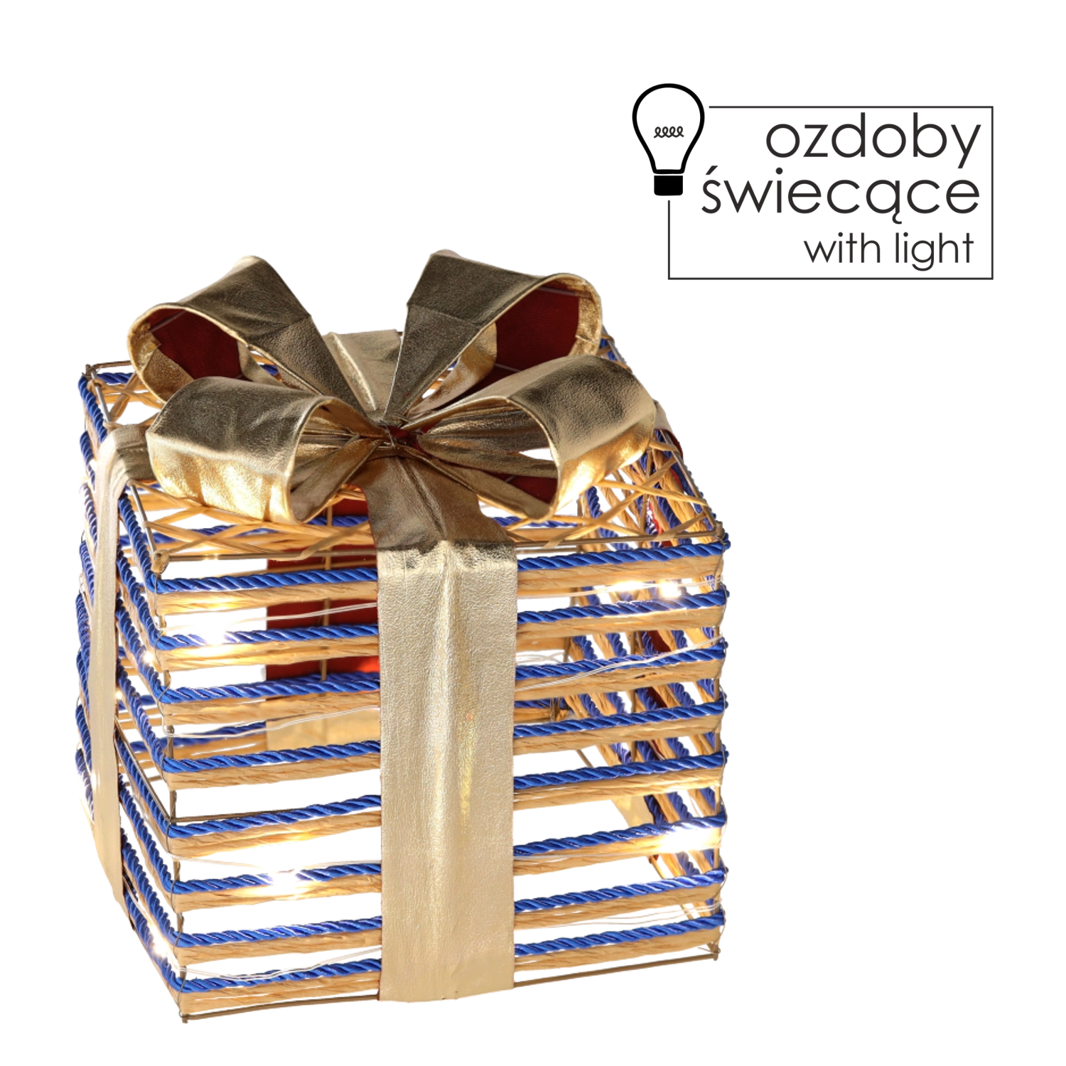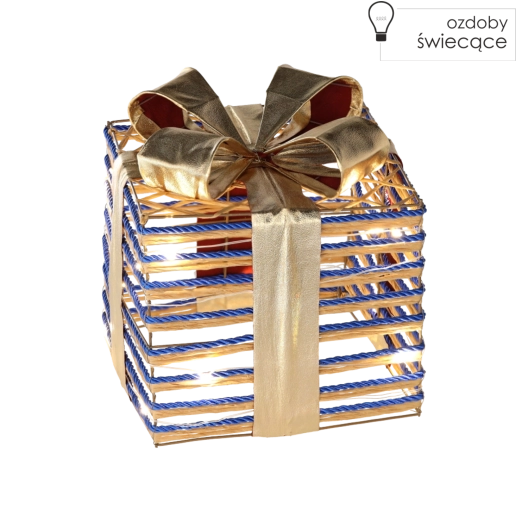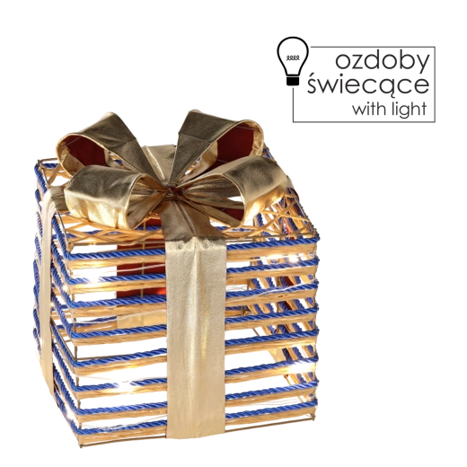 Elegáns karácsonyi dekoráció ajándékdoboz formában, kék masnival és finom LED világítással, amely meleg hangulattal ragyogja be otthonát. A praktikus elemes tápellátásnak köszönhetően könnyedén elhelyezhető a fa alá, a kandallópárkányra vagy kirakatba. A masszív szerkezet zsinórral bevont drótból hosszú élettartamot és stílusos megjelenést biztosít.